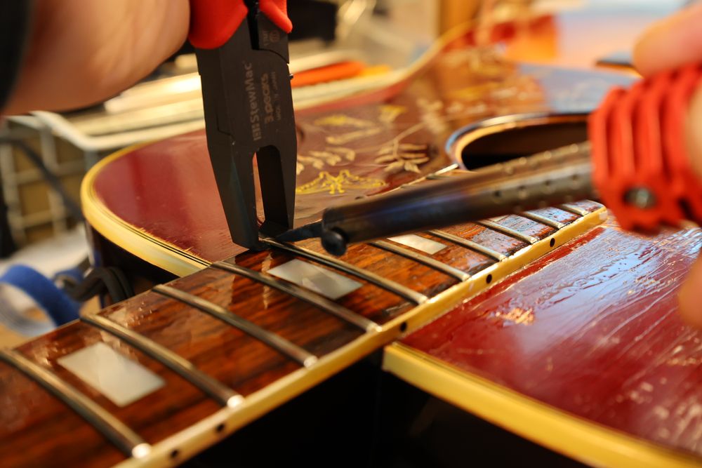- 13.フレットベンダーでフレットにアールをつけていきます。
