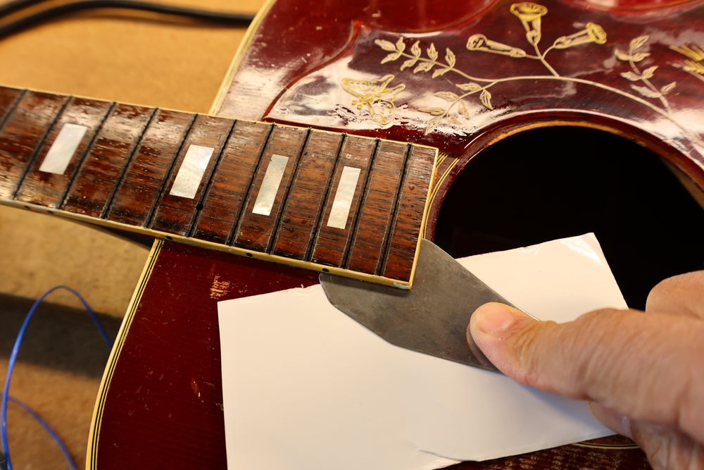 - 9.フレット溝の中のゴミ類を削り出します。このときもフレット溝エッジを傷つけないように注意します。