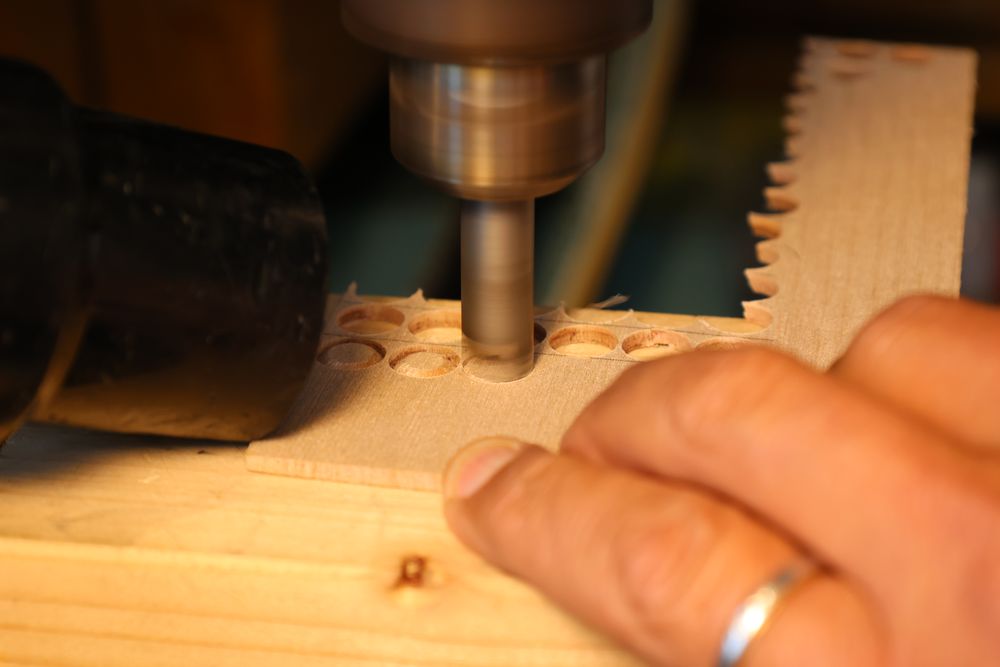 - 13.さらにミニルーターで弦の導出角度をつけていきます。