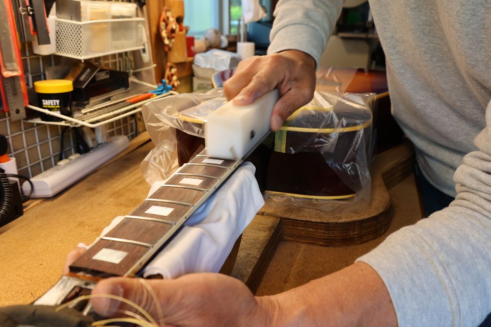 - 39.平らになったフレット山を専用のヤスリで丸くしていきます。