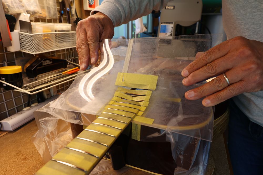 - 28.ネック取り付けの直線性を確認します。直線けがき線の入ったアクリル板をネックからブリッジにかけて乗せます。