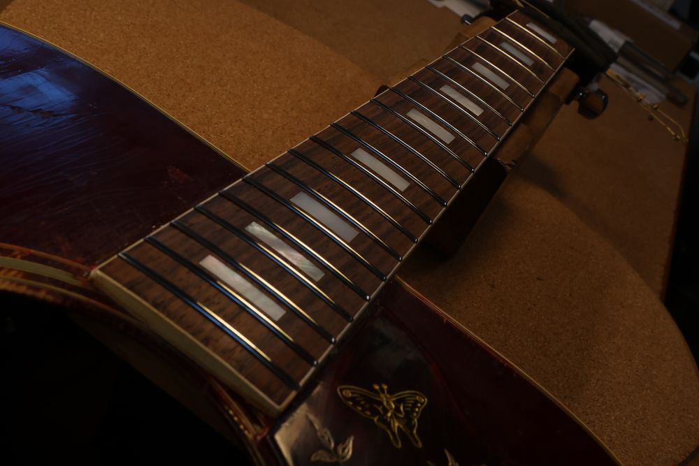 Hummingbirdのリペアご依頼をいただき、ネックリセット、フレット交換、ブリッジプレート・リペアなどを含むトータルリペアを行いました。