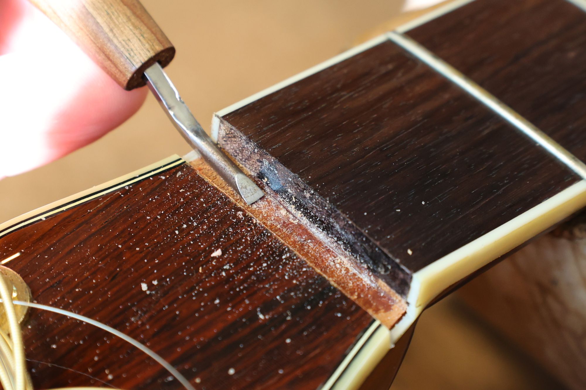 - 22.ストリングリフターで弦を待避させて、ナット溝を徐々に下げていきます。