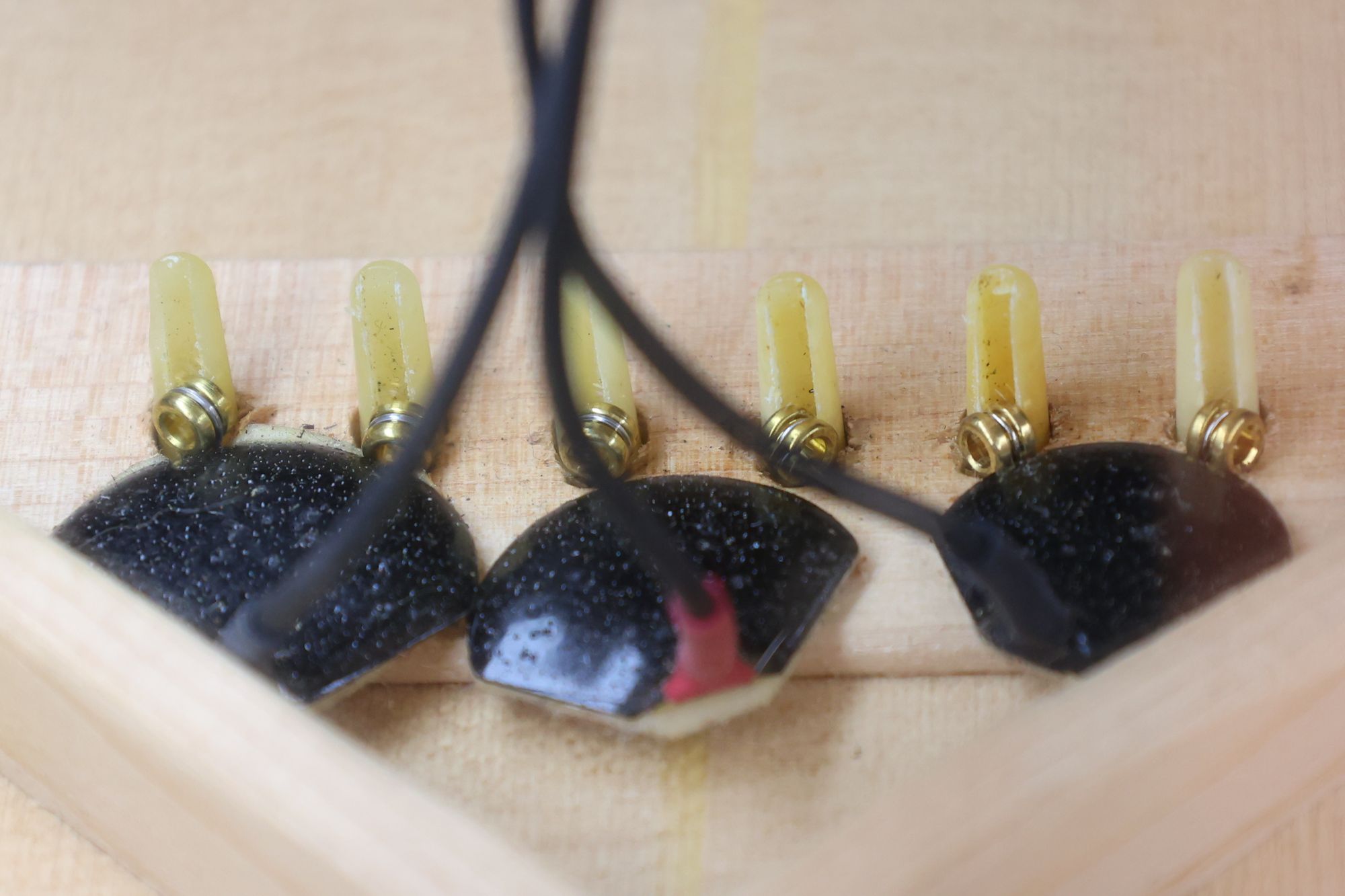 - 1.オリジナルピックアップです。ブリッジプレートに3つのコンタクトピックアップが接着されています。