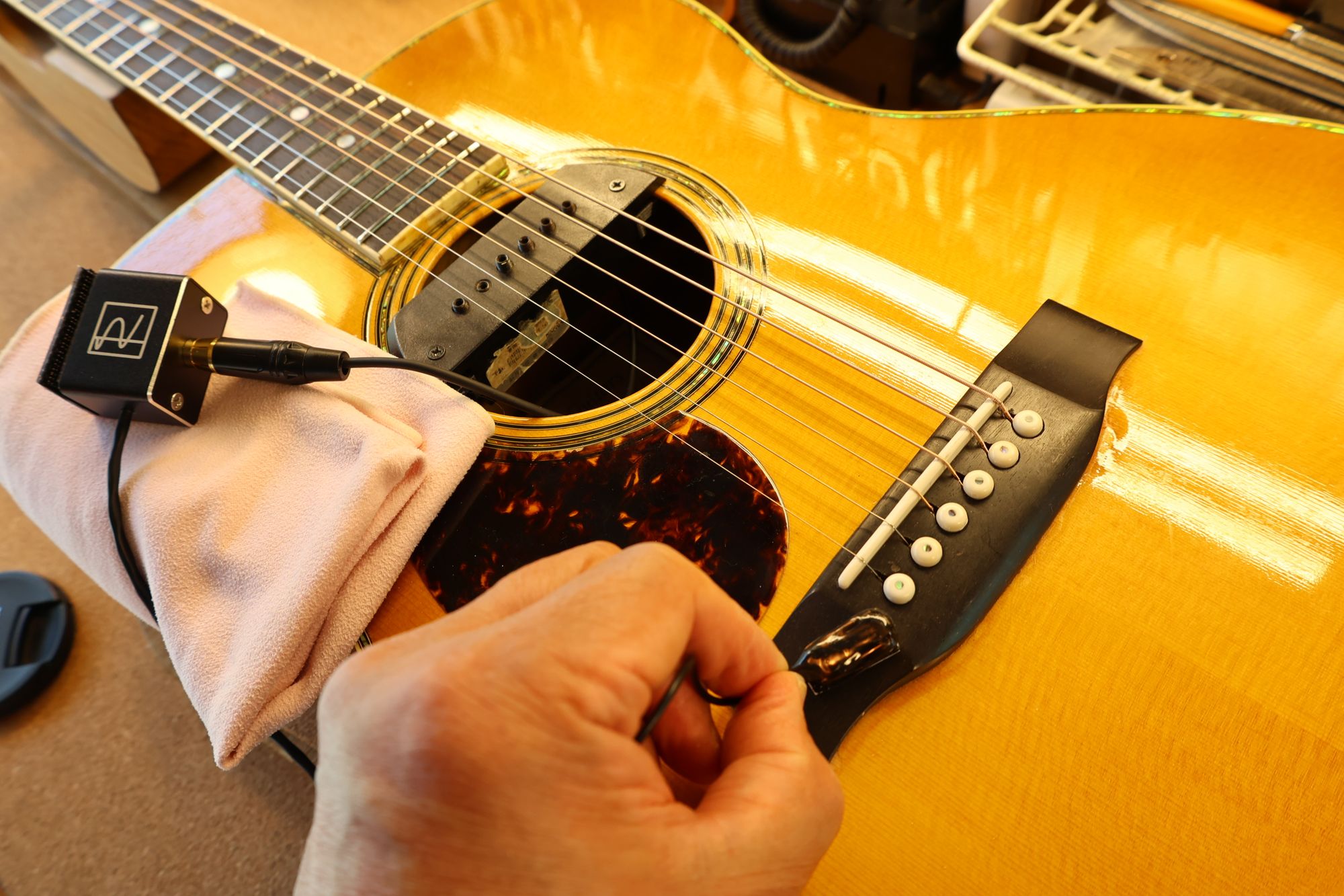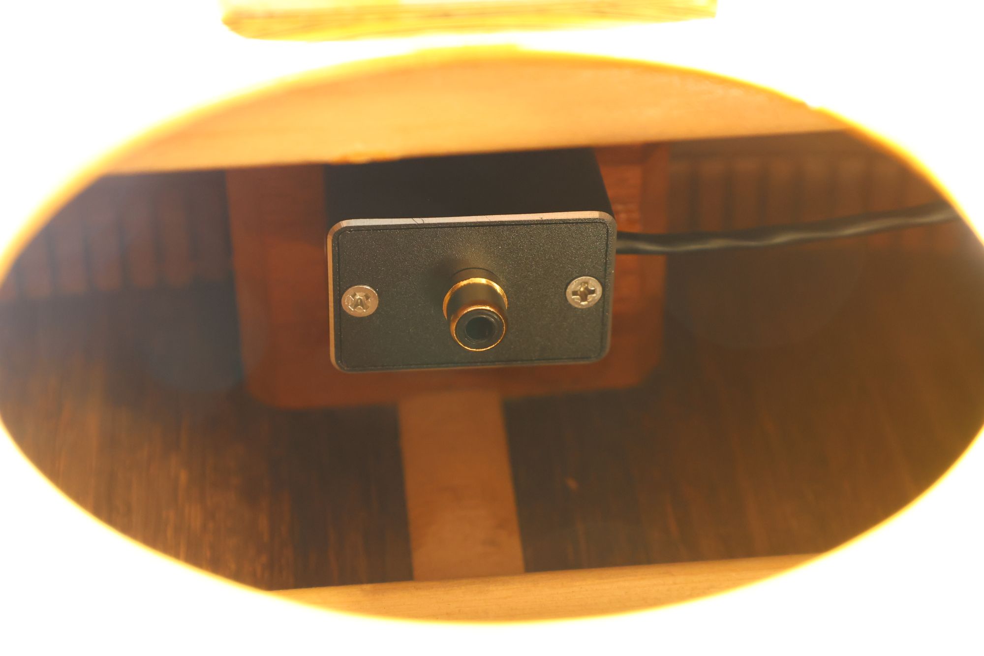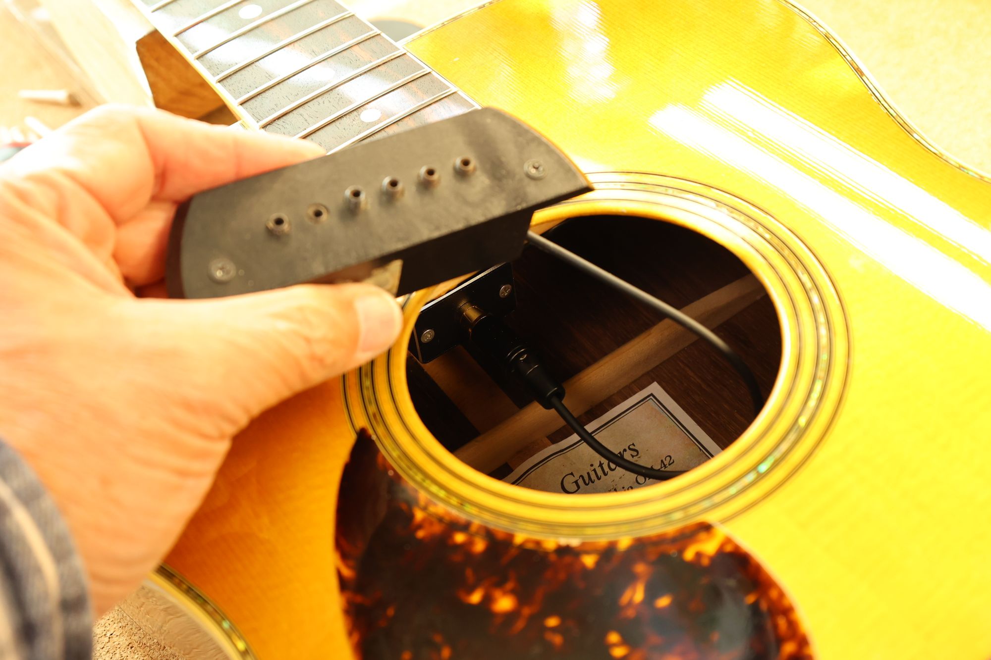 - 1.サウンドホールにチューナー、サドル位置にイントネーターを取り付けました。