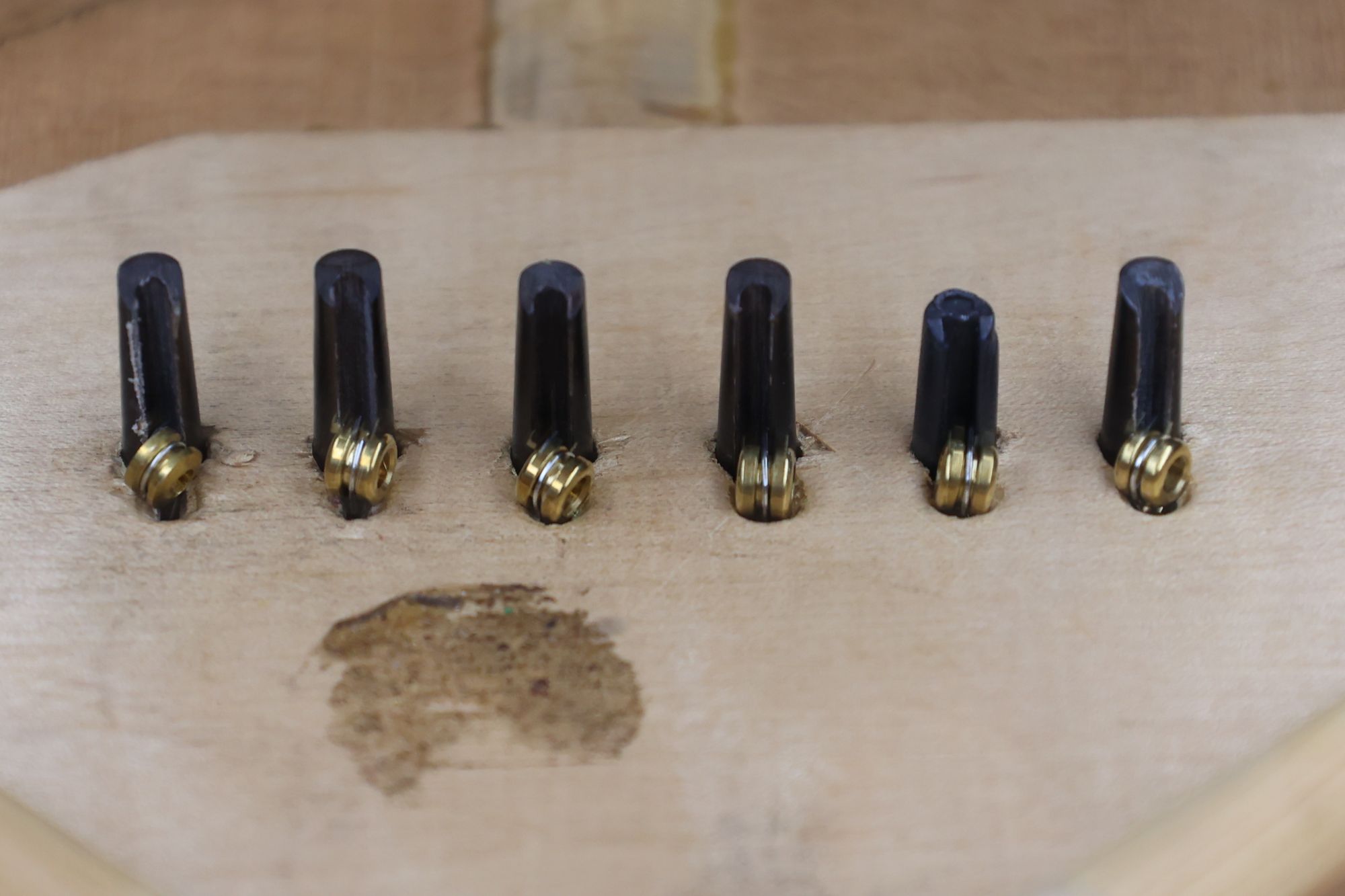 - 17.1,3,5弦のプラグ固定が終わりました。このとき木目方向を確認しておきます。