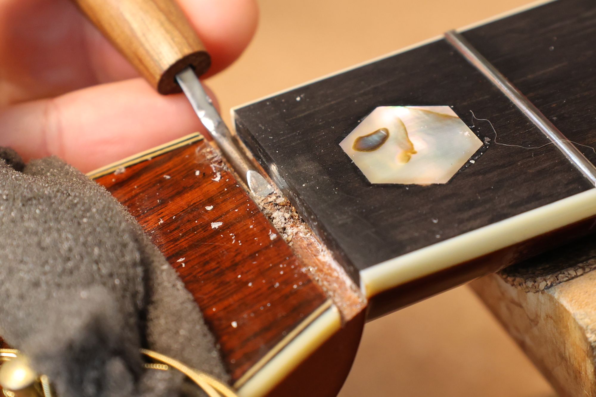 - 10.フィンガーボード面が露出した部分にアバロン素材がはまり込むようにルーターで削り込みます。