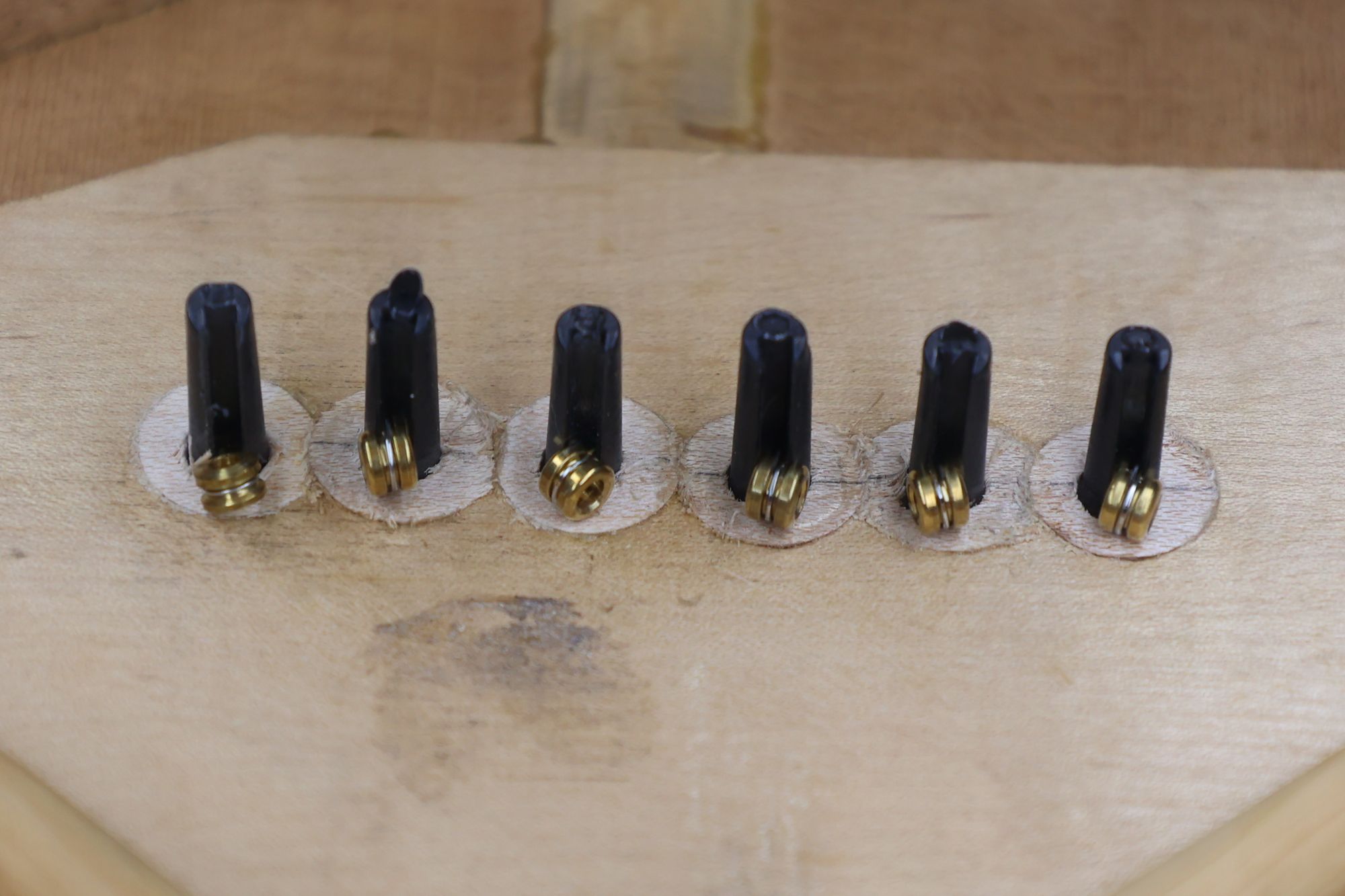 - 19.1,3,5弦のプラグ固着後、同じように2,4,6弦のプラグ接着を行います。