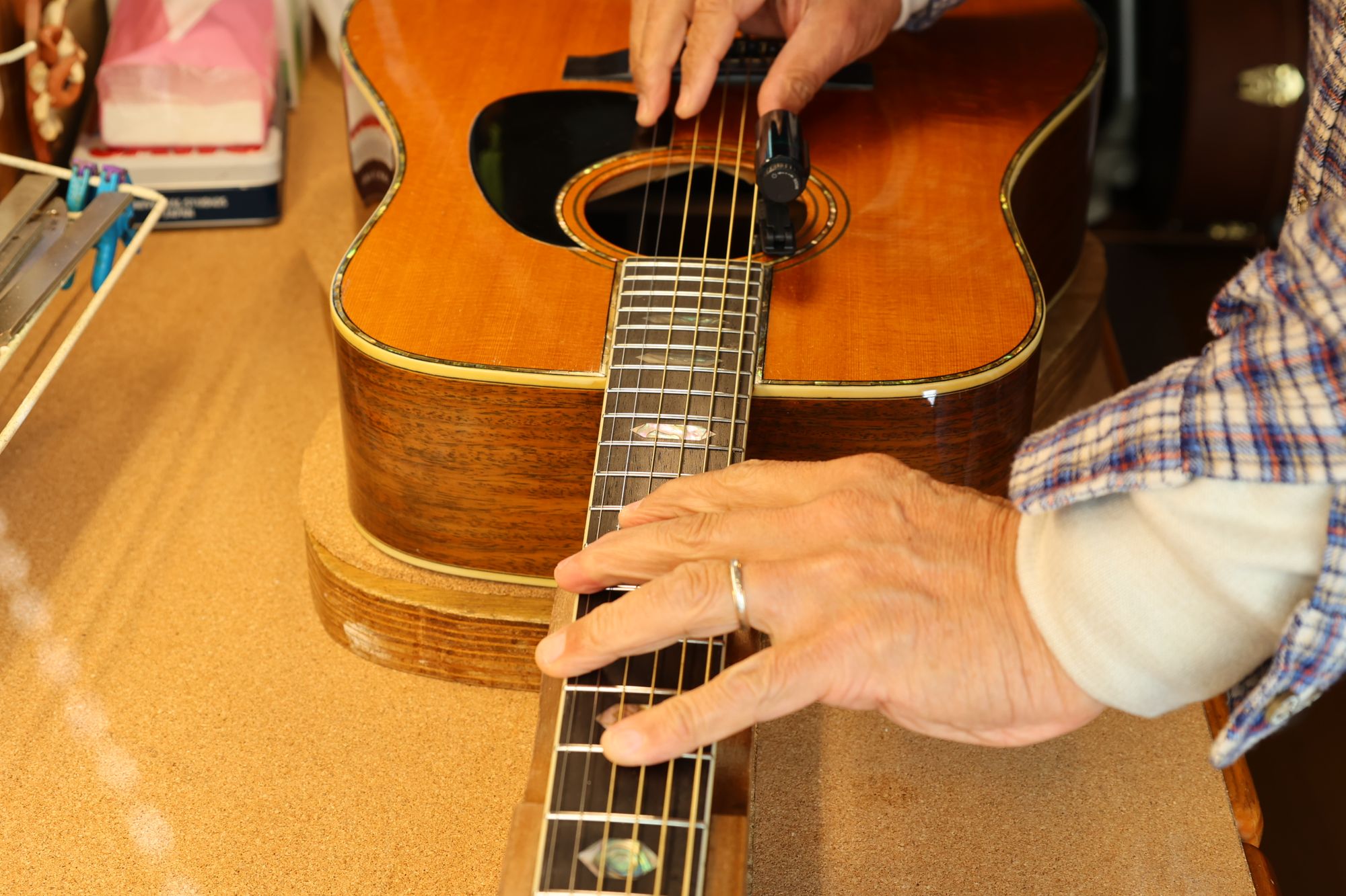 リペア前の試奏では弦高が高くて弾きにくいのと、こもりがちの音色でギターがとても寂しそうに見えました。