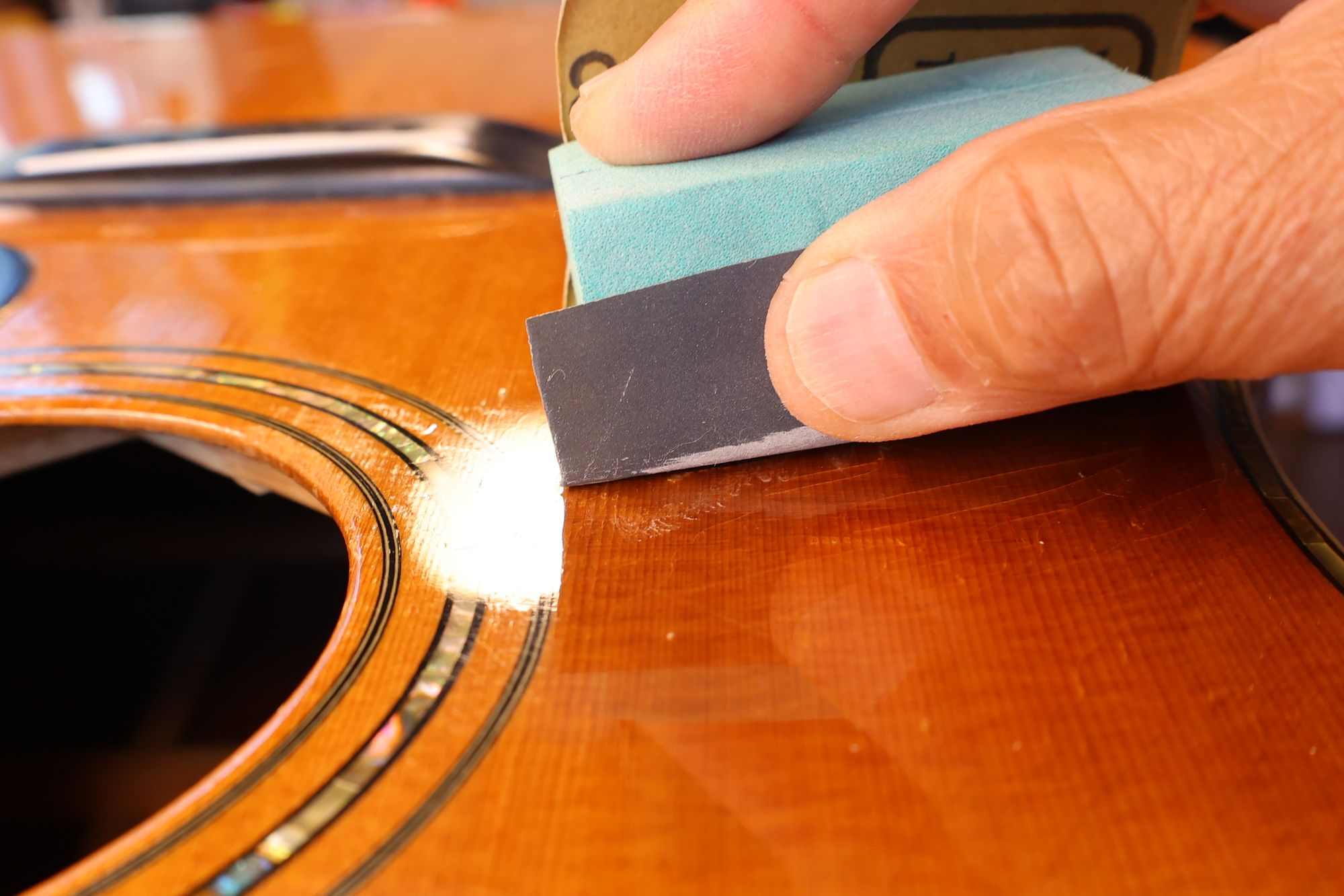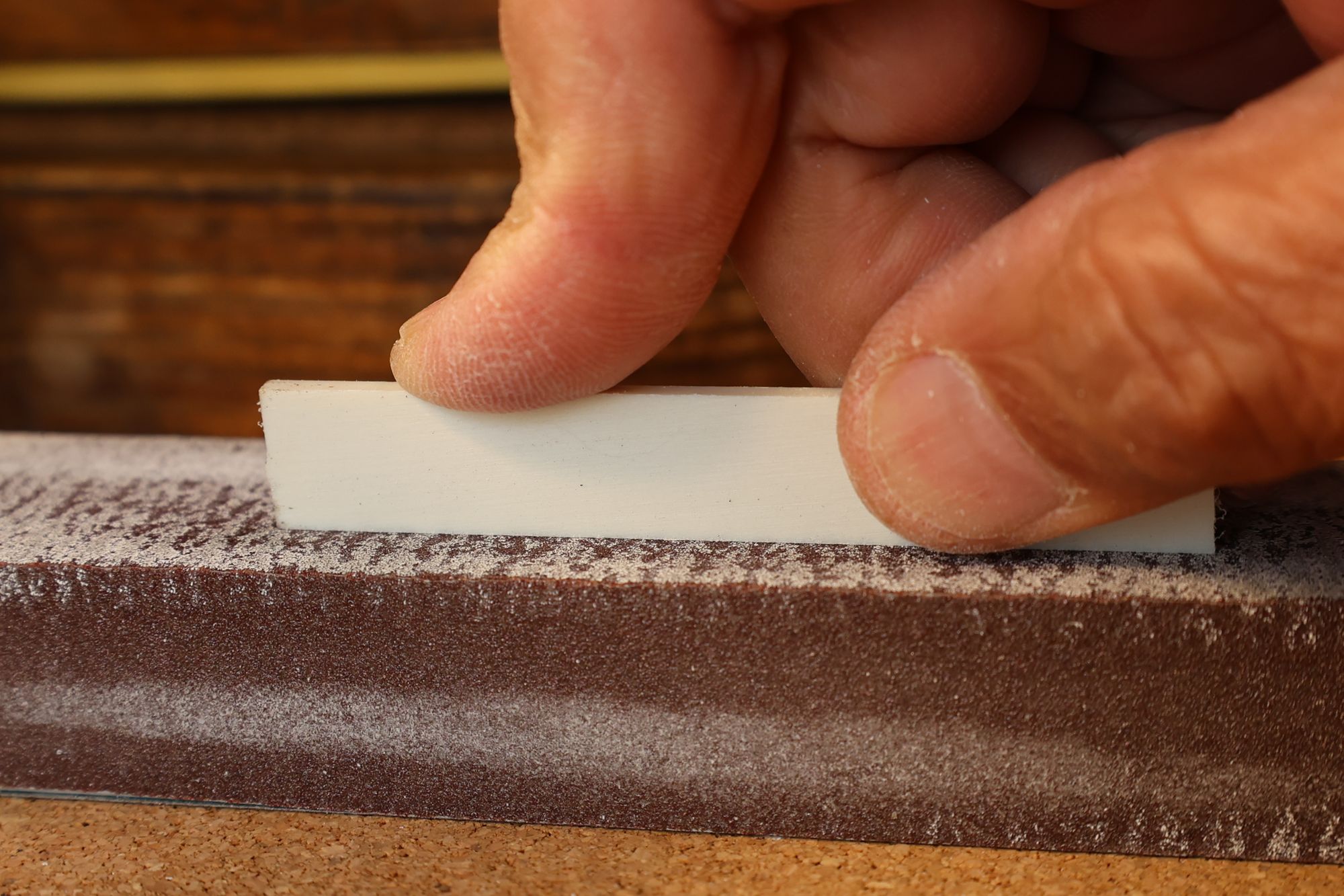 - 14.ペースト固着後、フィンガー簿イードのアールにあったサンディングブロックでサンディングします。