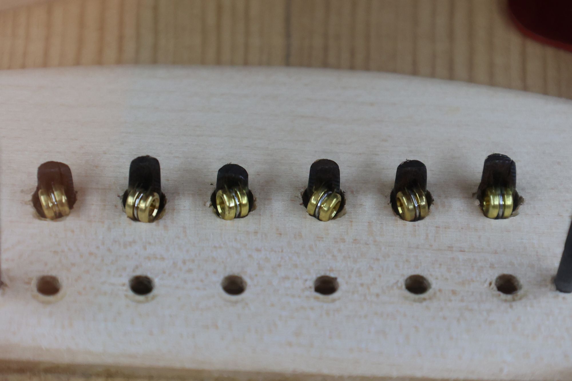 - 19.1,3,5弦のプラグ固着後、同じように2,4,6弦のプラグ接着を行います。