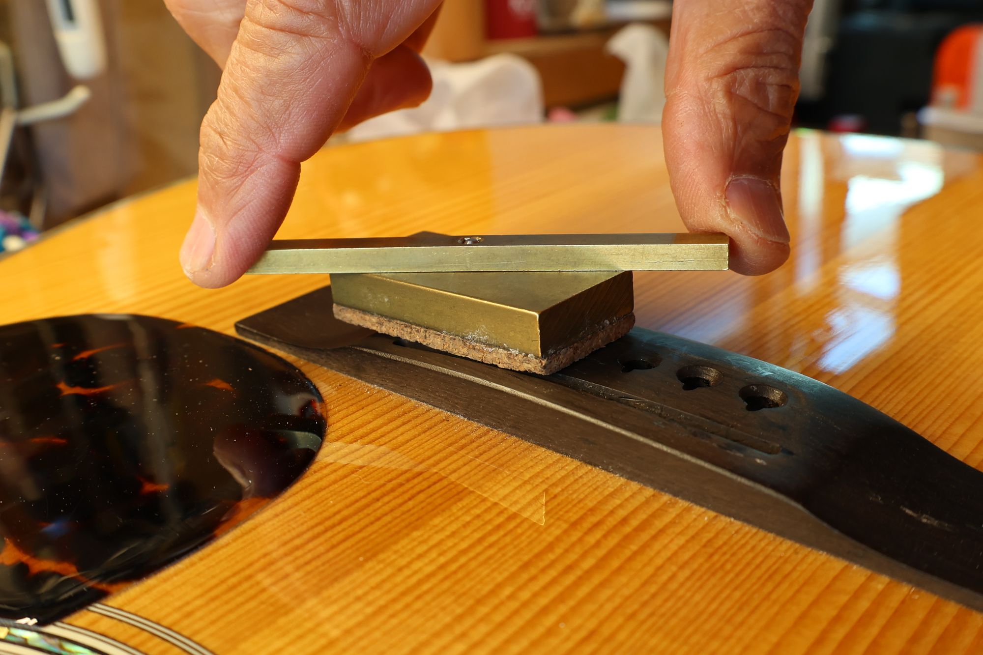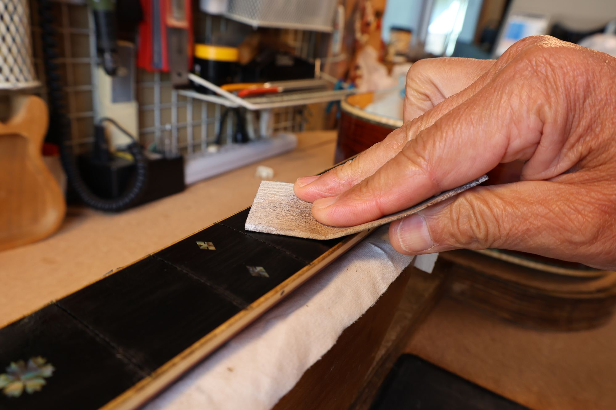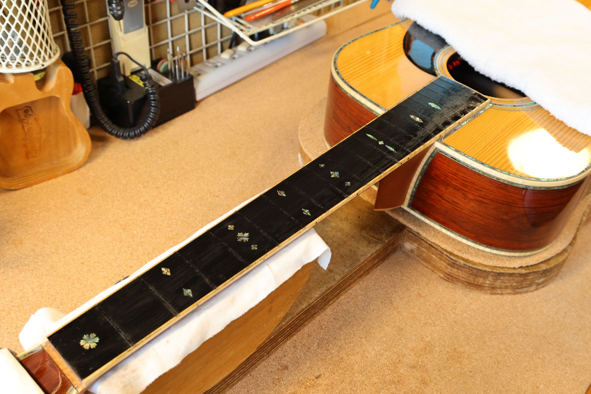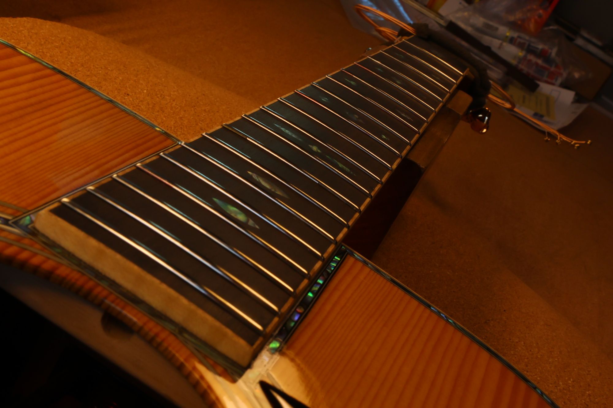 - 12.目視および指で触ってネック、フィンガーボードと段差のないことを確認しておきます。