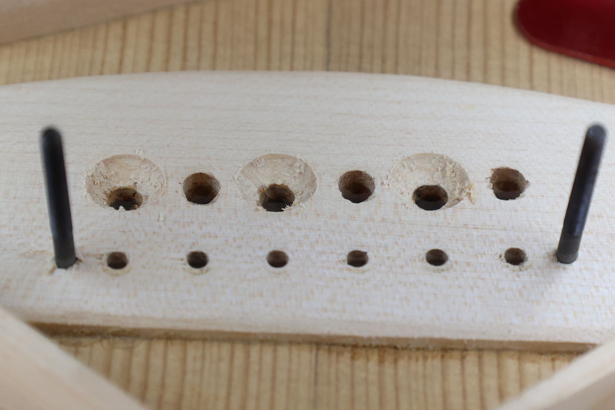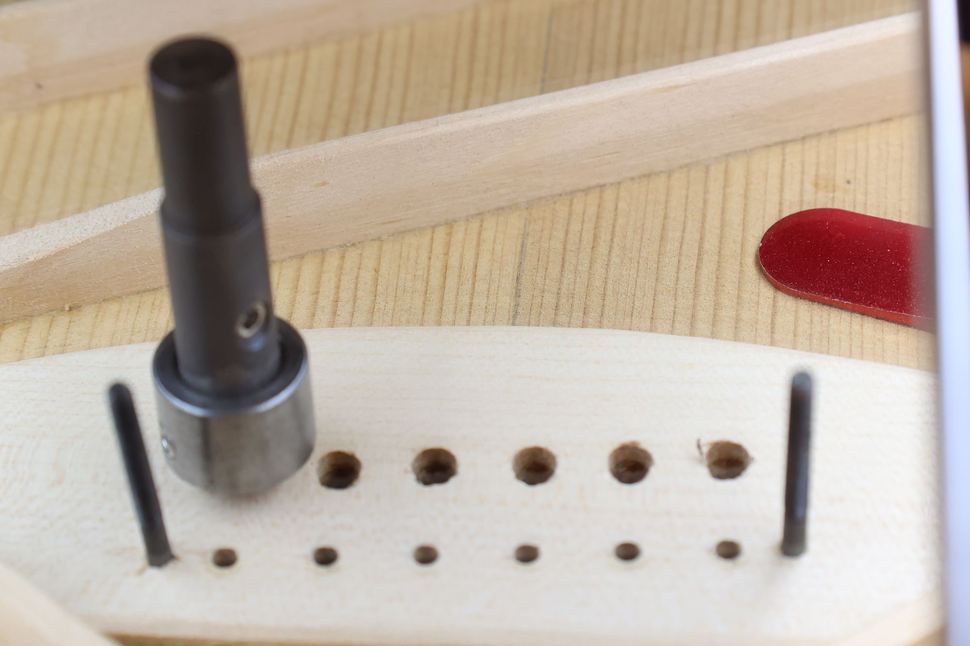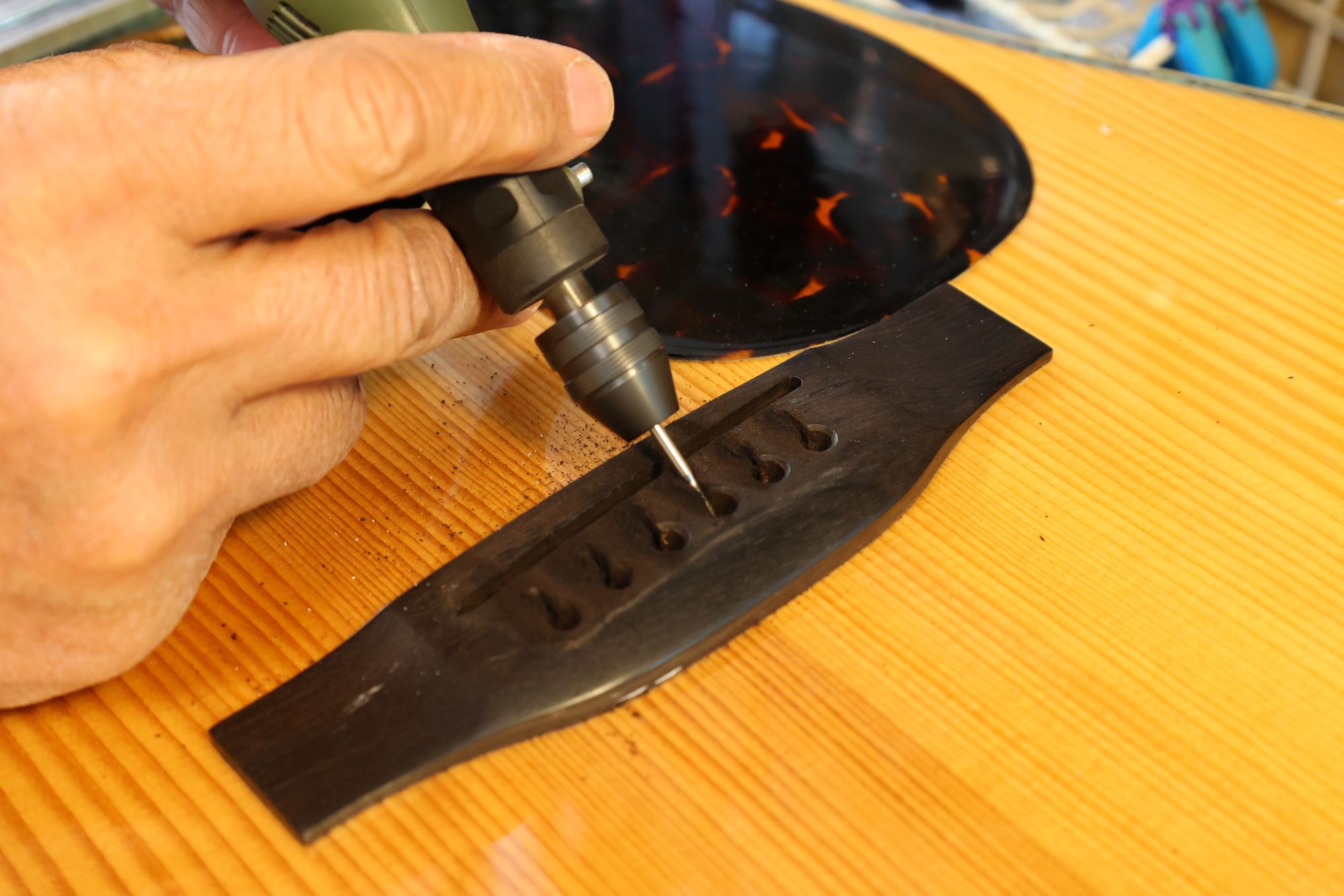 - 13.さらにミニルーターで弦の導出角度をつけていきます。