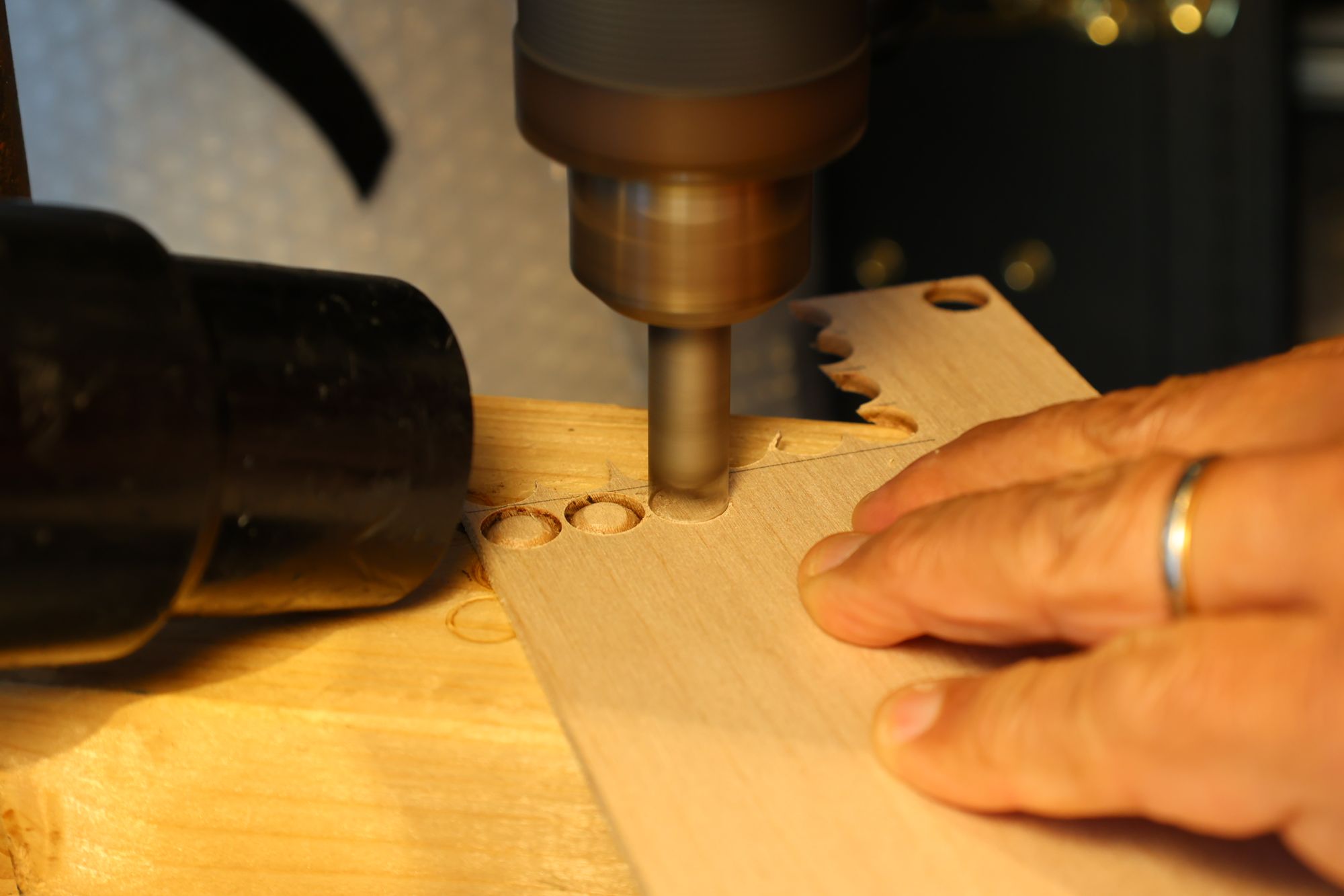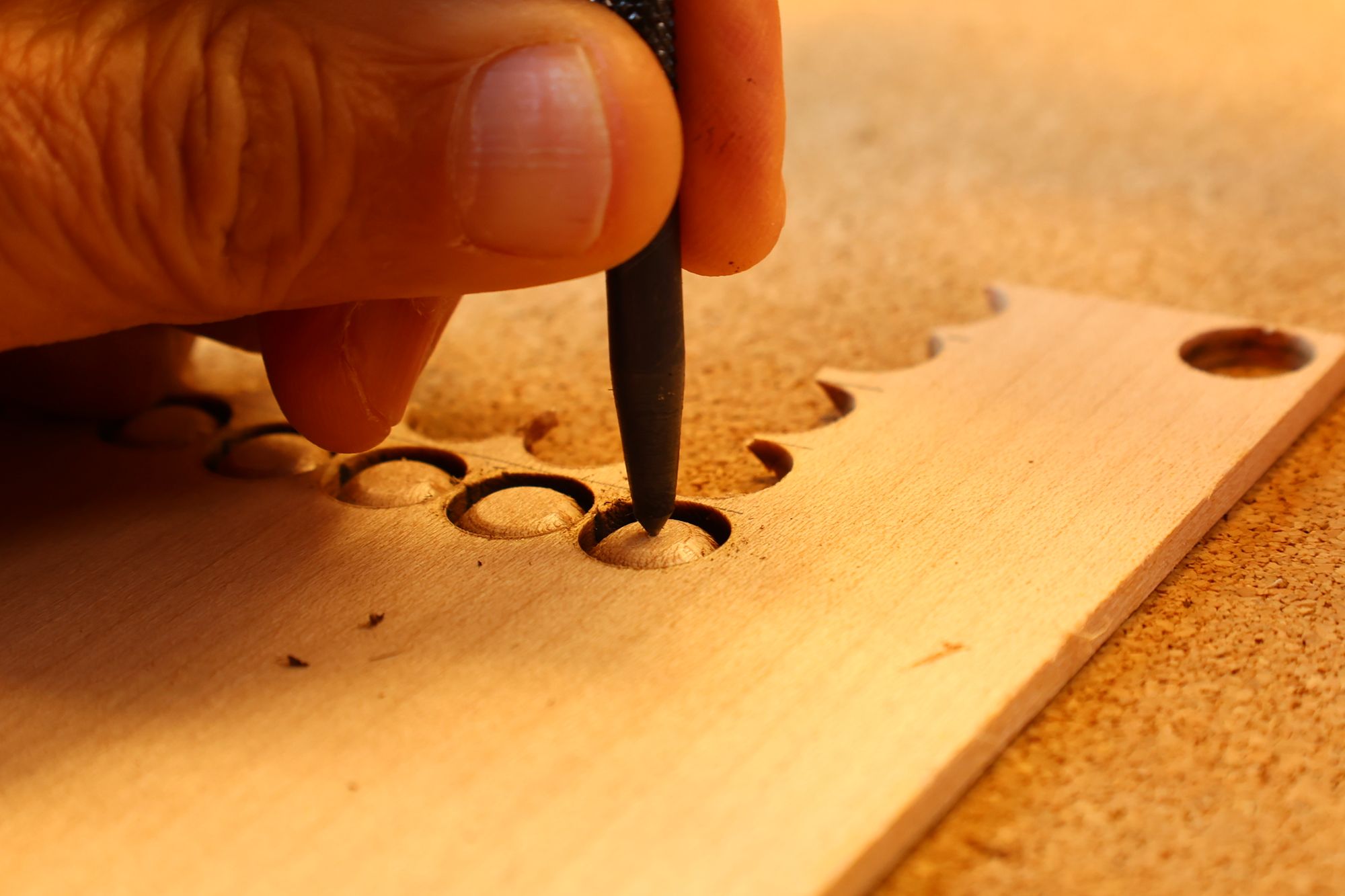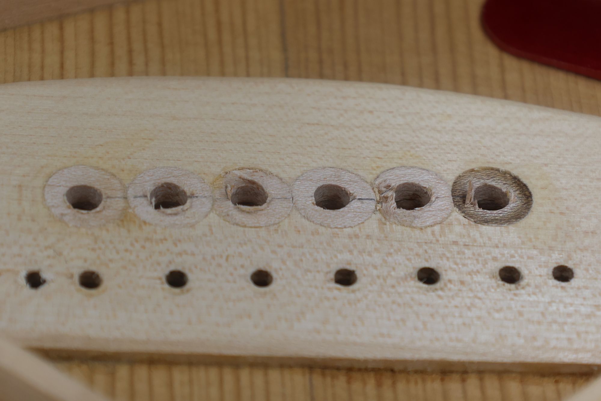 - 13.さらにミニルーターで弦の導出角度をつけていきます。