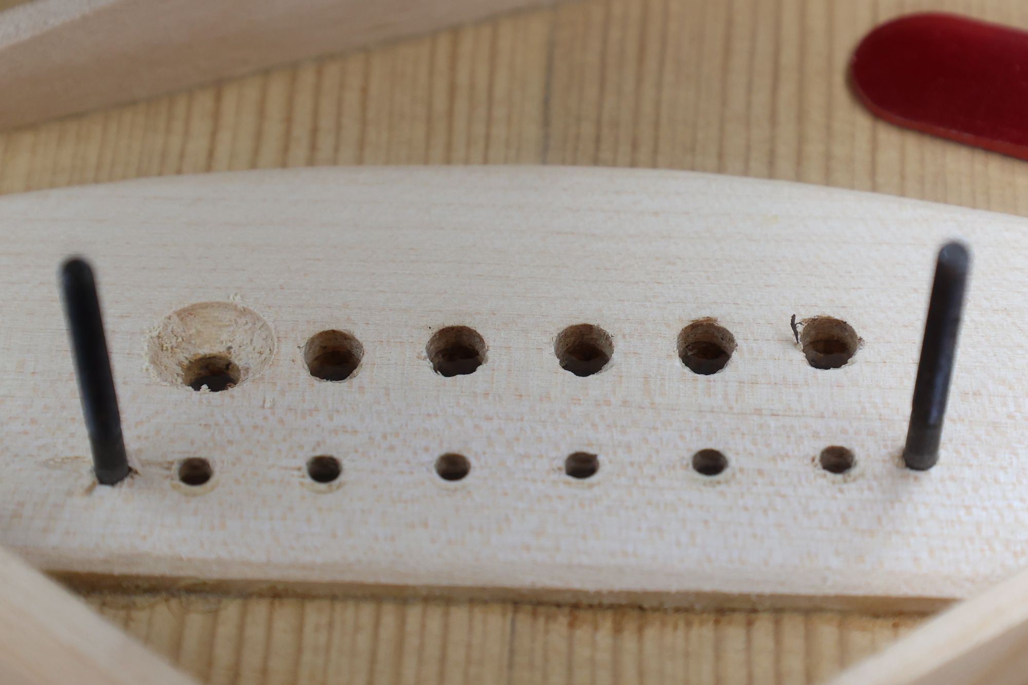 - 17.1,3,5弦のプラグ固定が終わりました。このとき木目方向を確認しておきます。