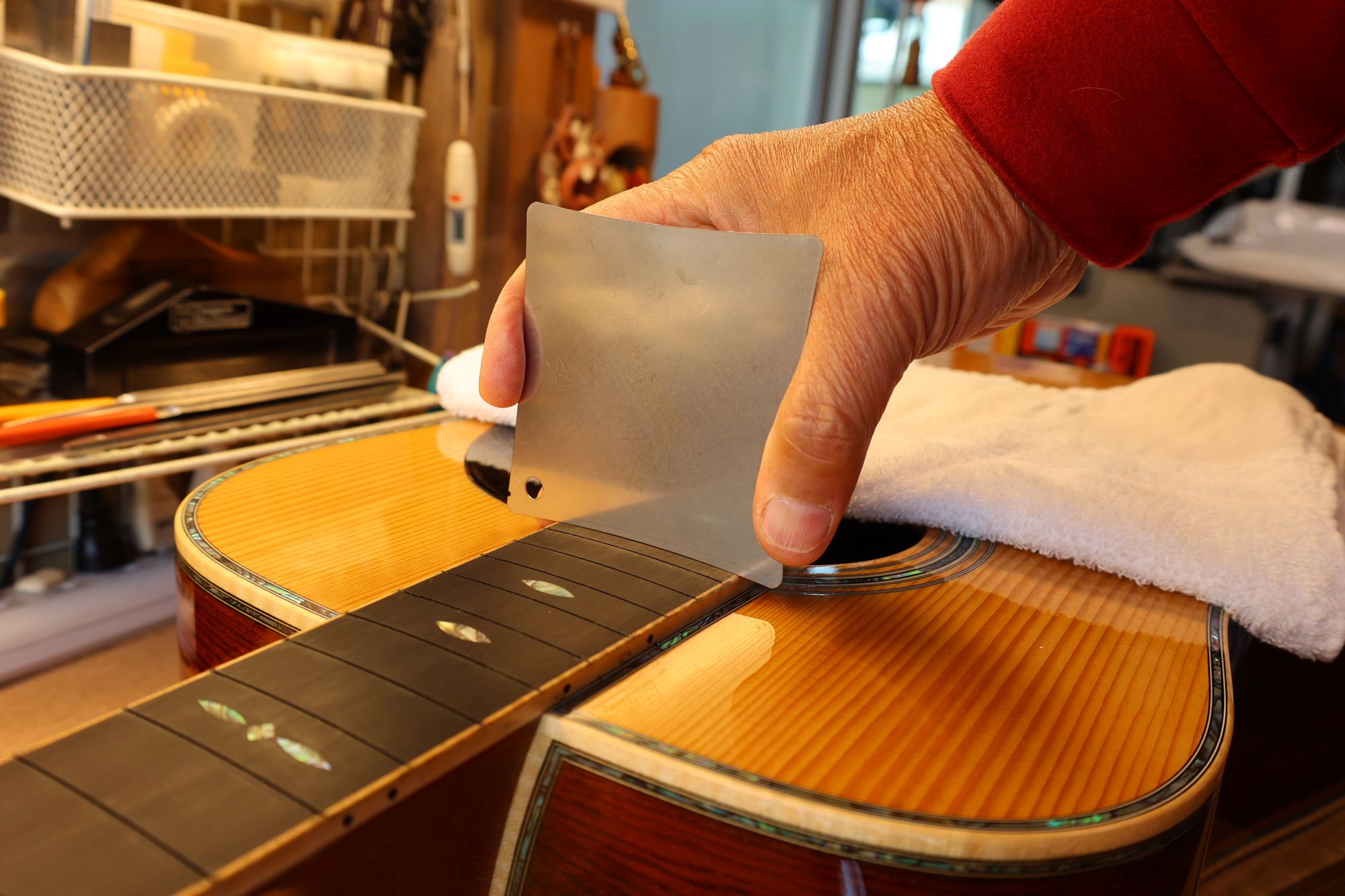 - 3.フィンガーボードの平面性を確認します。