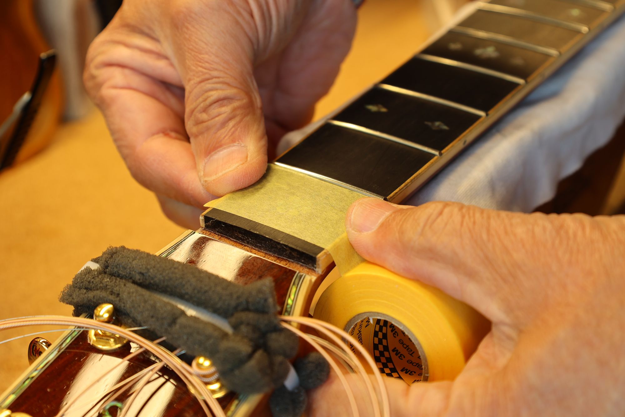 - 31.引き続いてフレットすりあわせを行いましょう。マスキングテープでフィンガーボードを保護します。