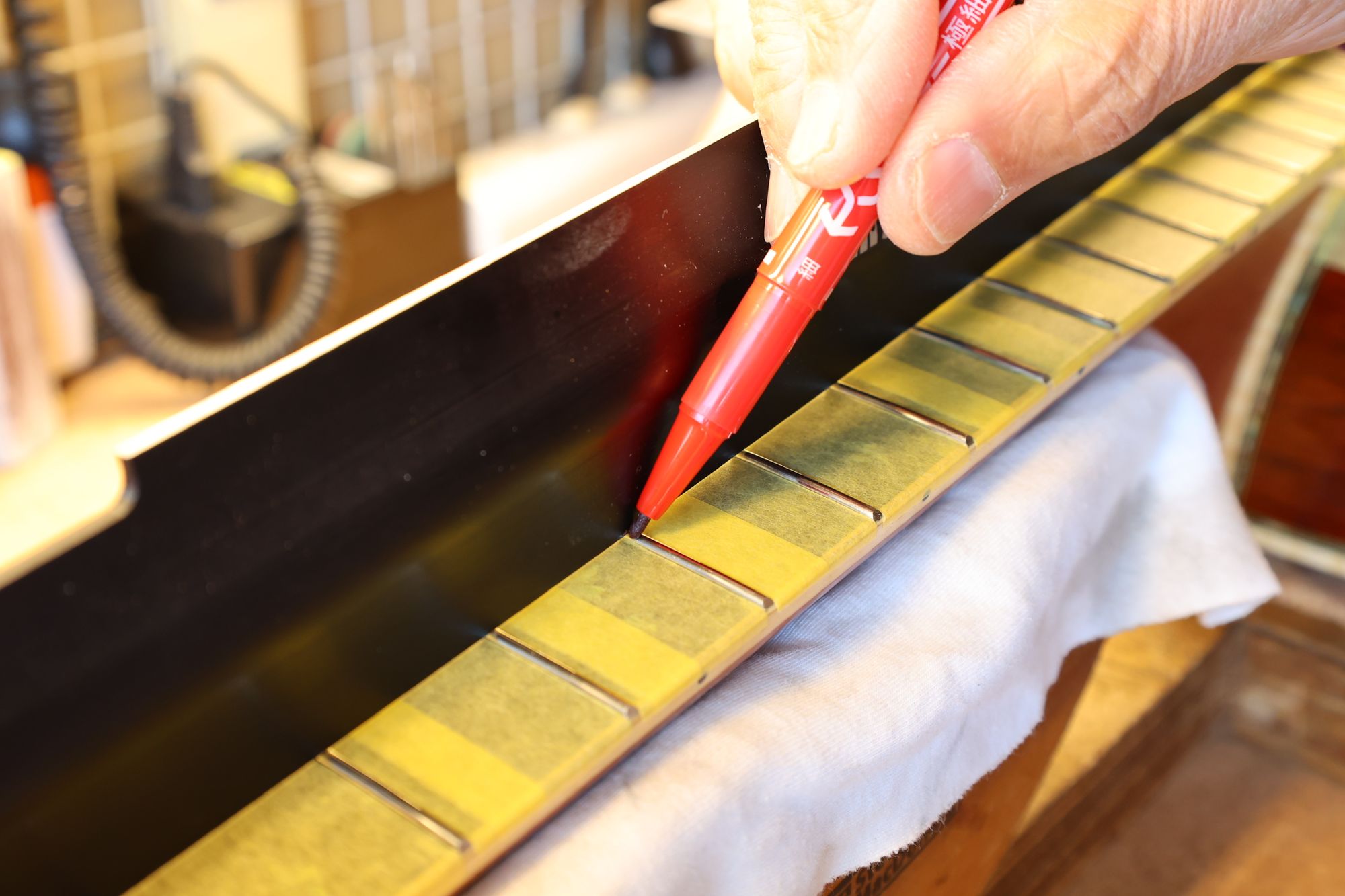 - 33.直定規を乗せて、フレット山が凹んでいる箇所にマークを入れます。