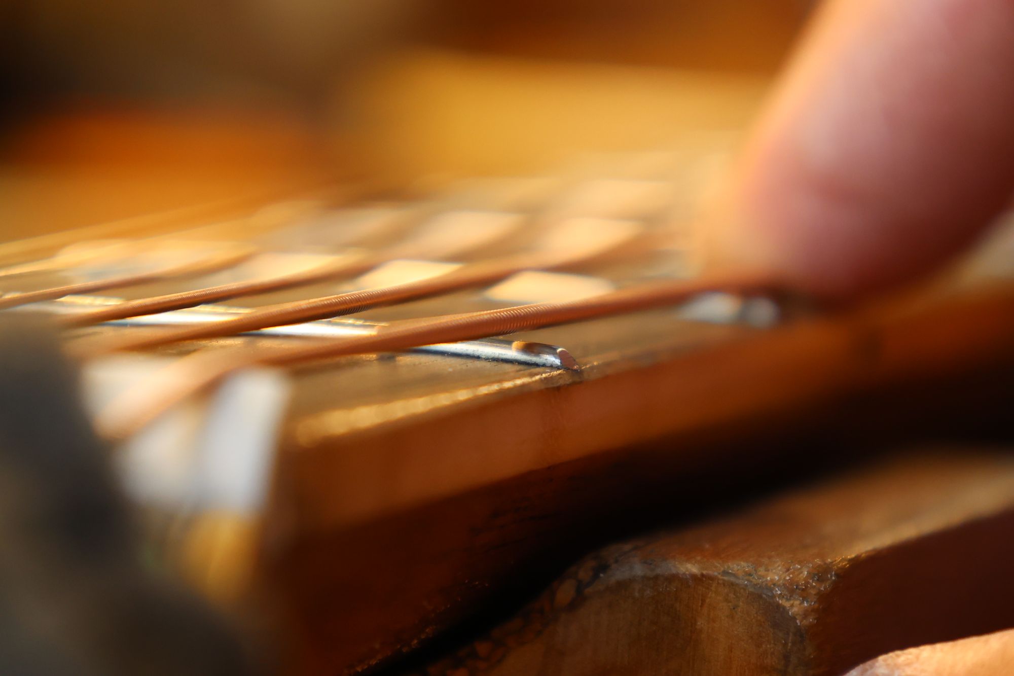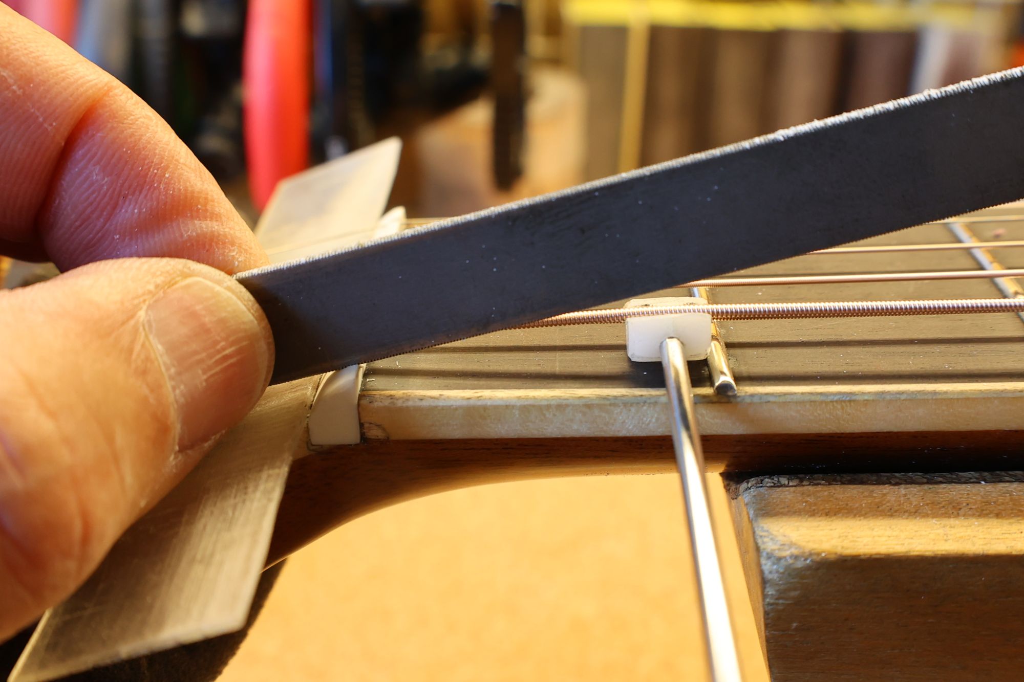 - 21.弦を張って弦高調整を行います。2フレットを指で押さえて1フレットと弦の隙間がギリギリに下がるまでナット高を下げます。