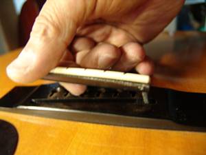 - 3.ピックアップ付きサドルを避けて、糸鋸の刃で弦の導出口をサドル溝側へ引き寄せます。