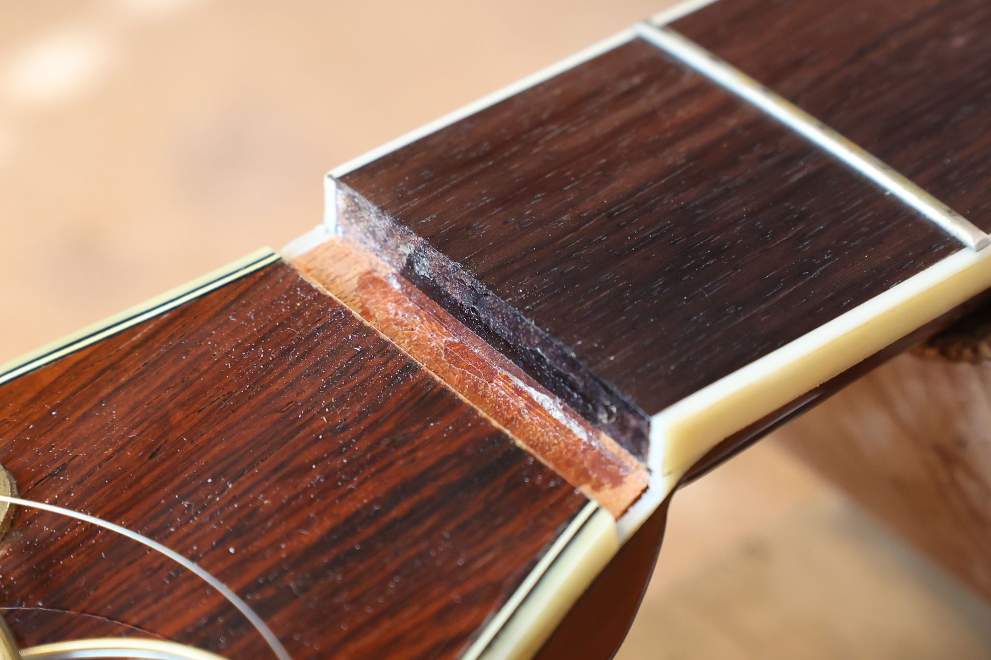 - 5.クリーニング完了したナット溝です。ナットが溝と直接触れることによってギターの音色の改善が期待できます。
