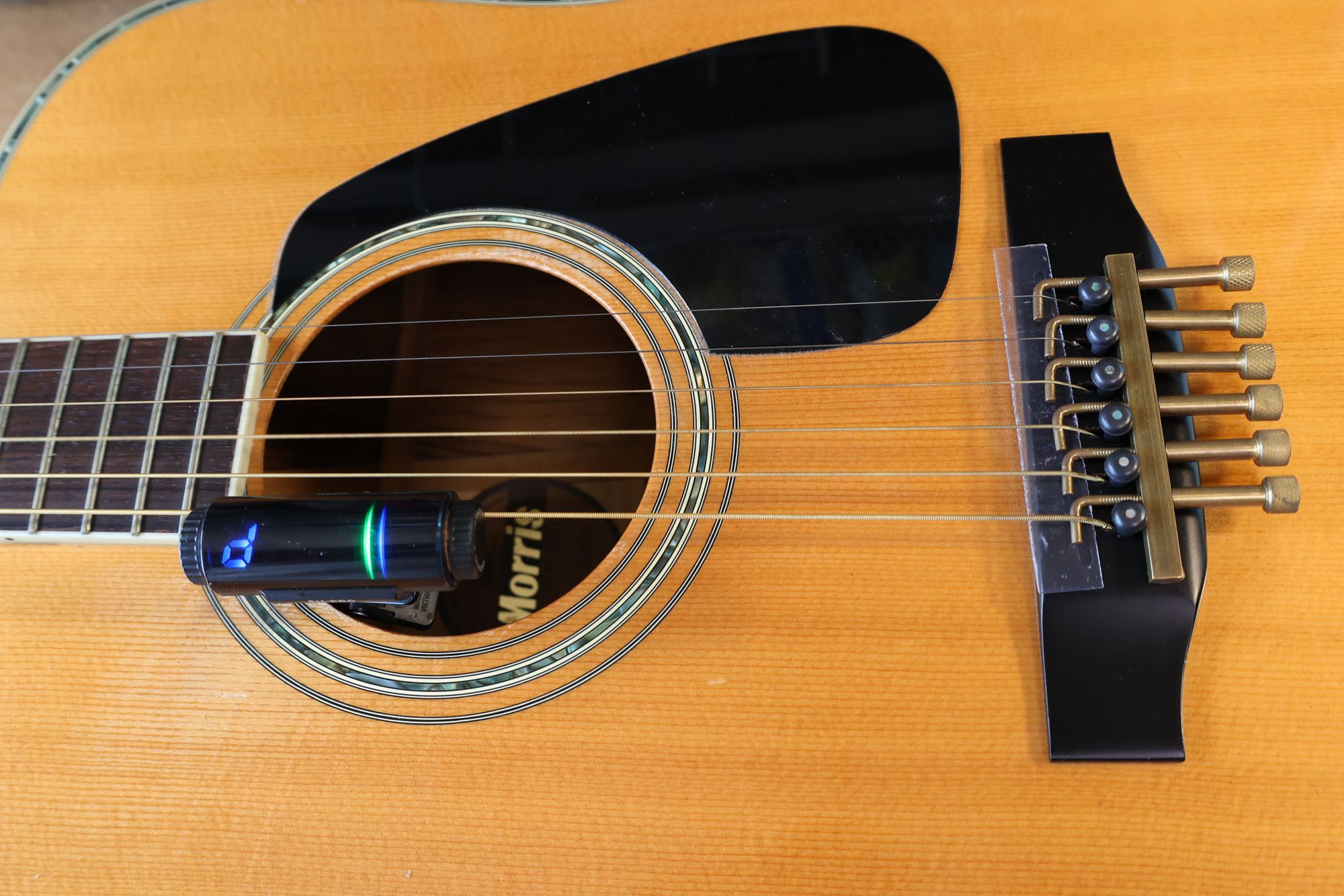 - 1.サウンドホールにチューナー、サドル位置にイントネーターを取り付けました。