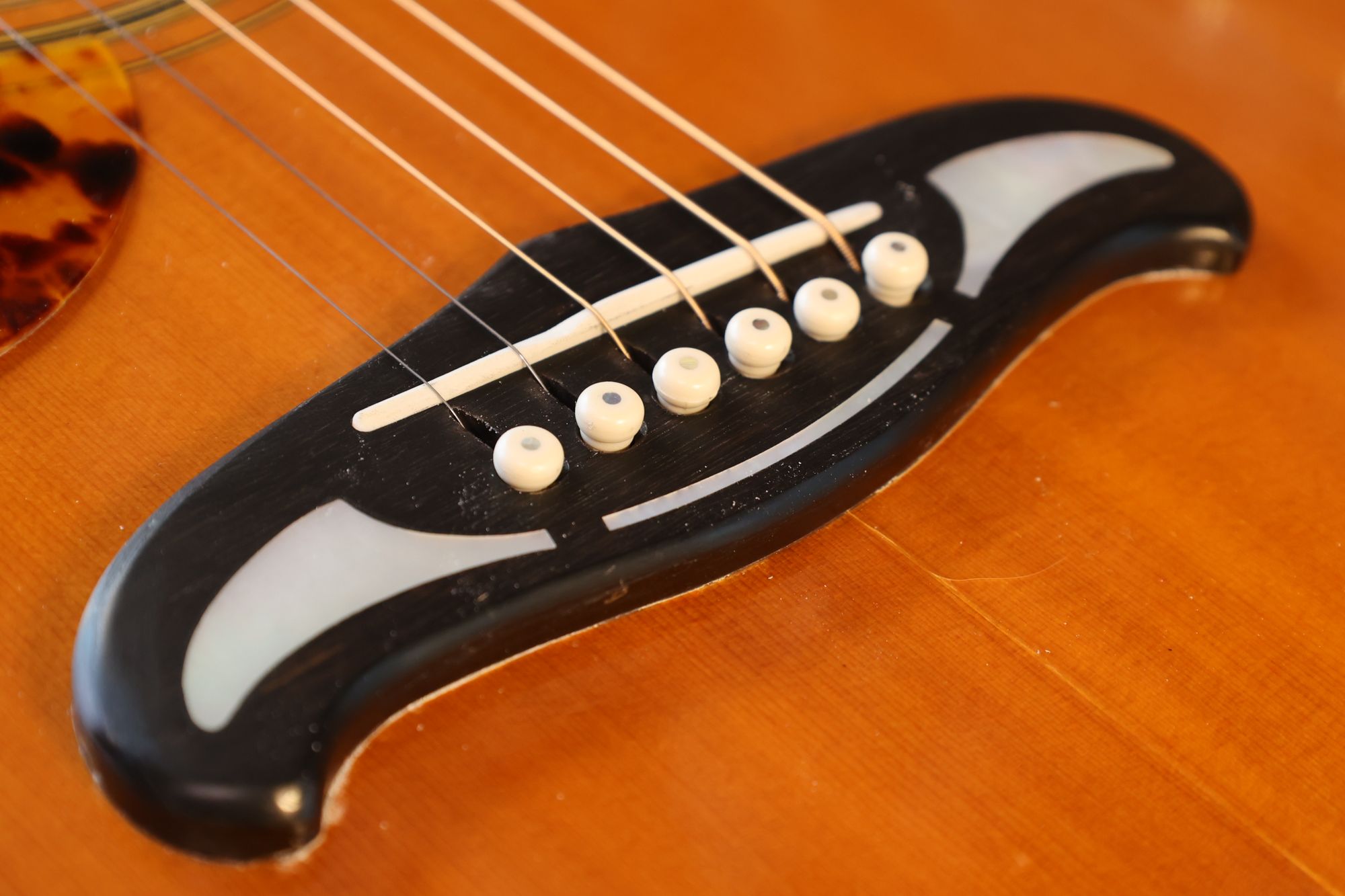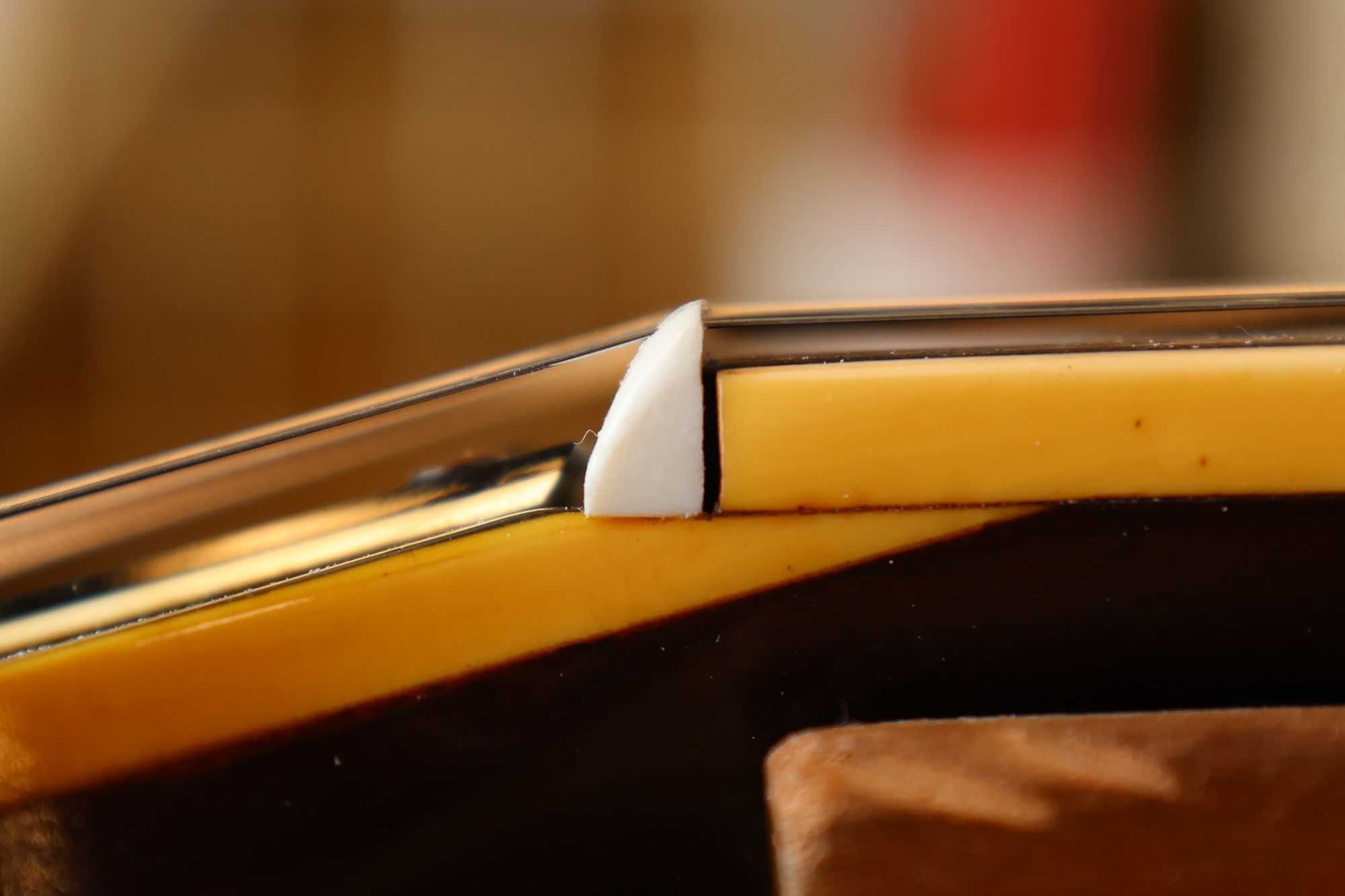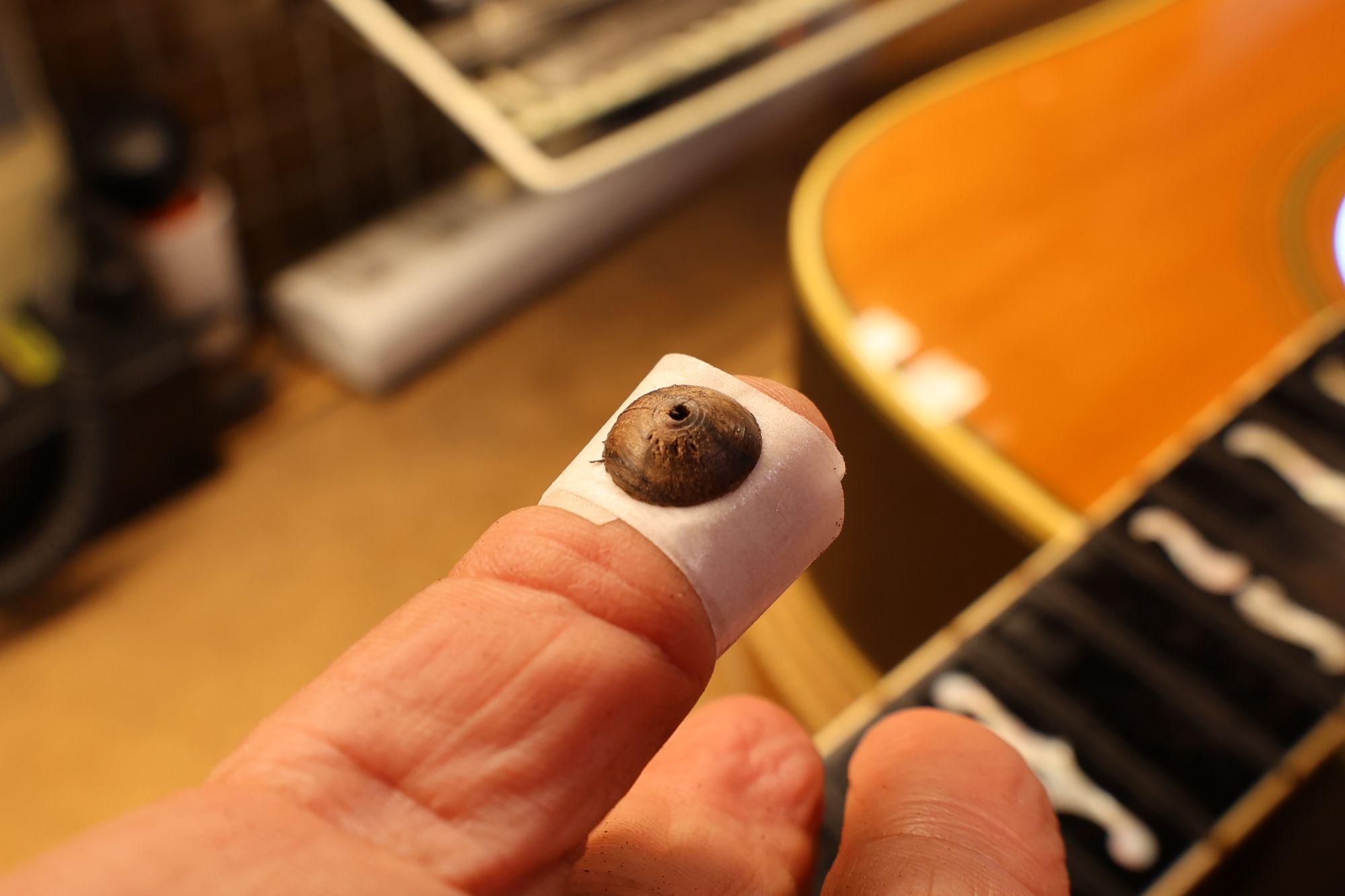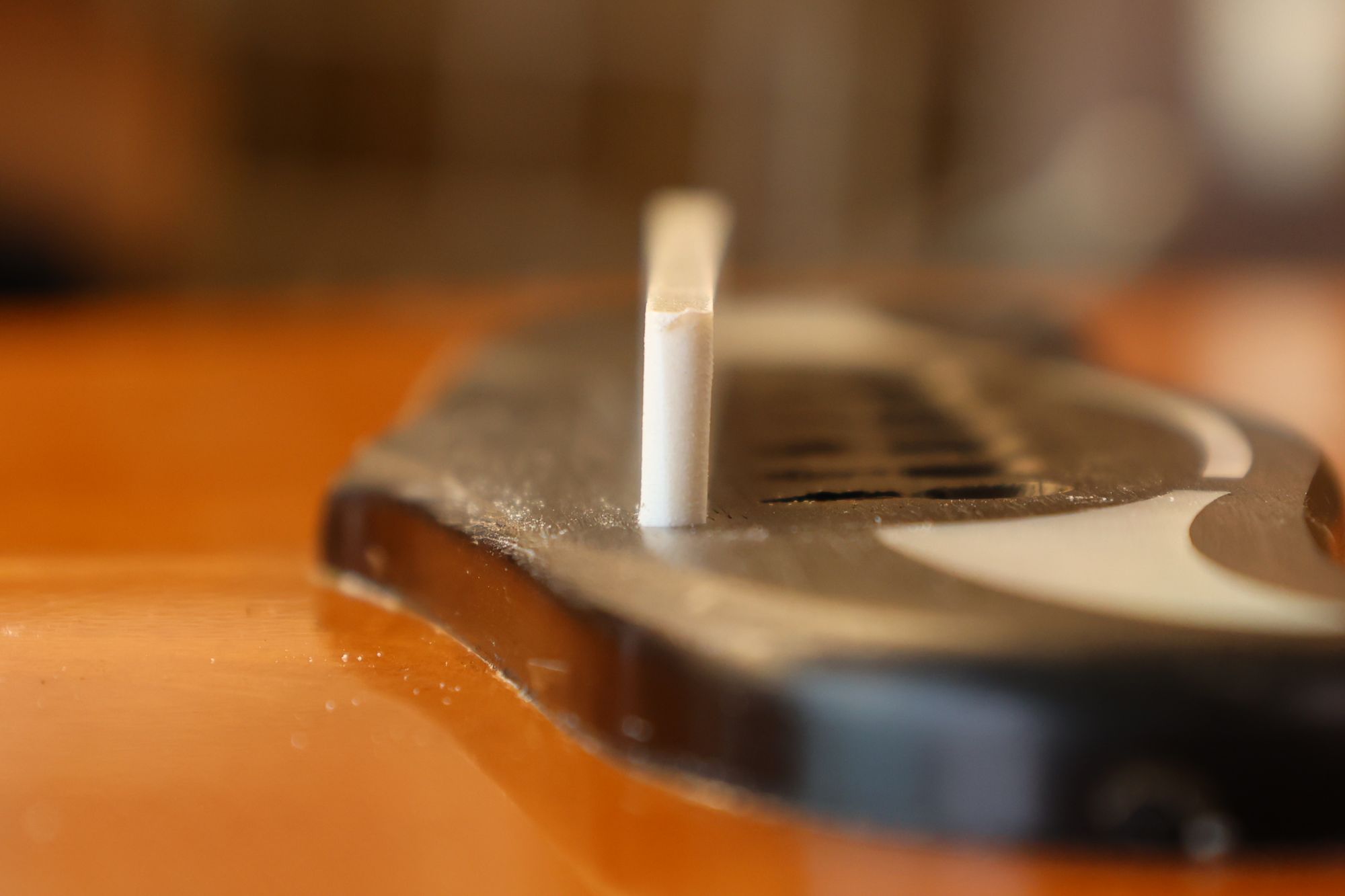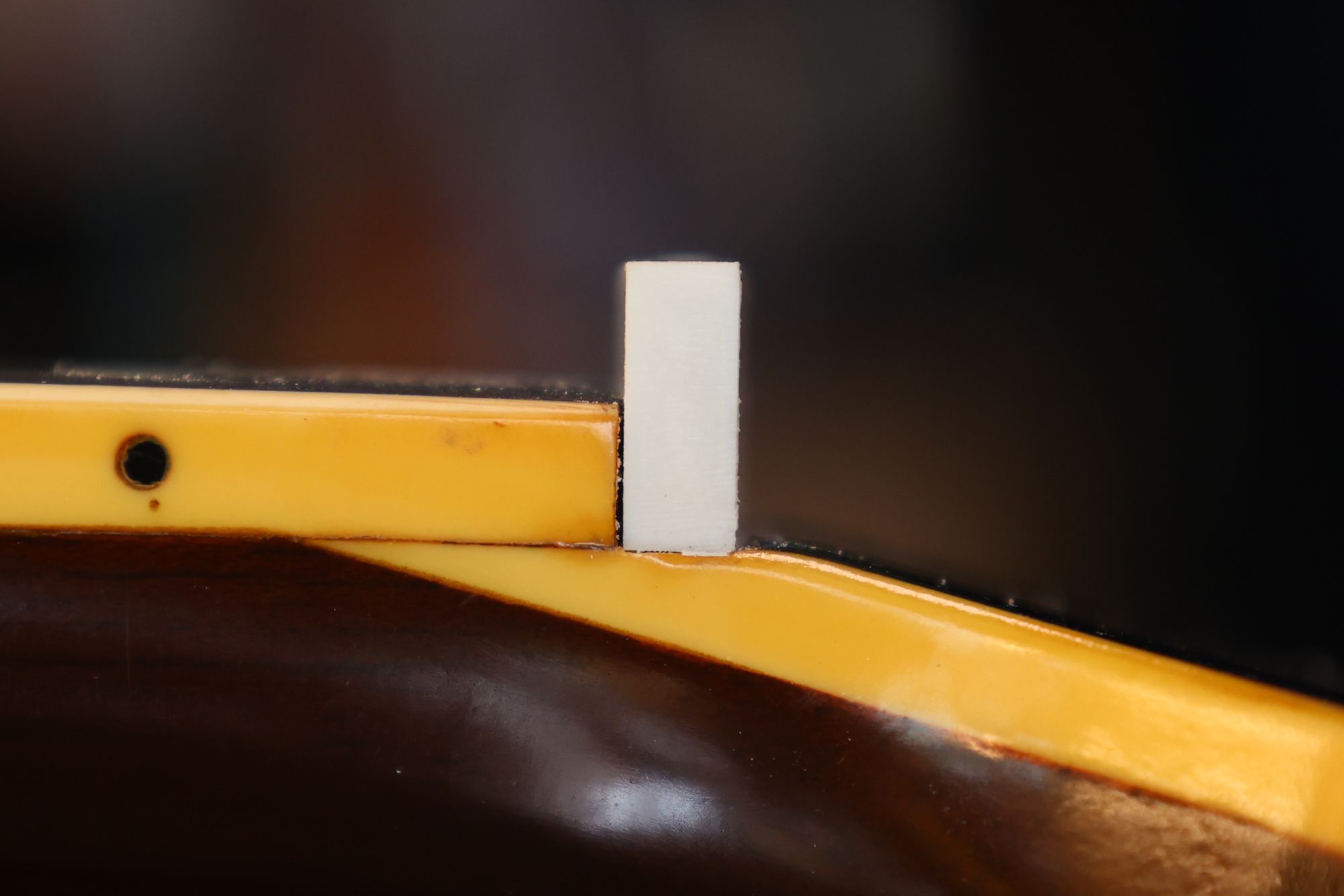 - 1.ボディ内部ブリッジの裏側に取り付けられているブリッジプレートです。弦のエンドポールが食い込んでしまう状態になっています。