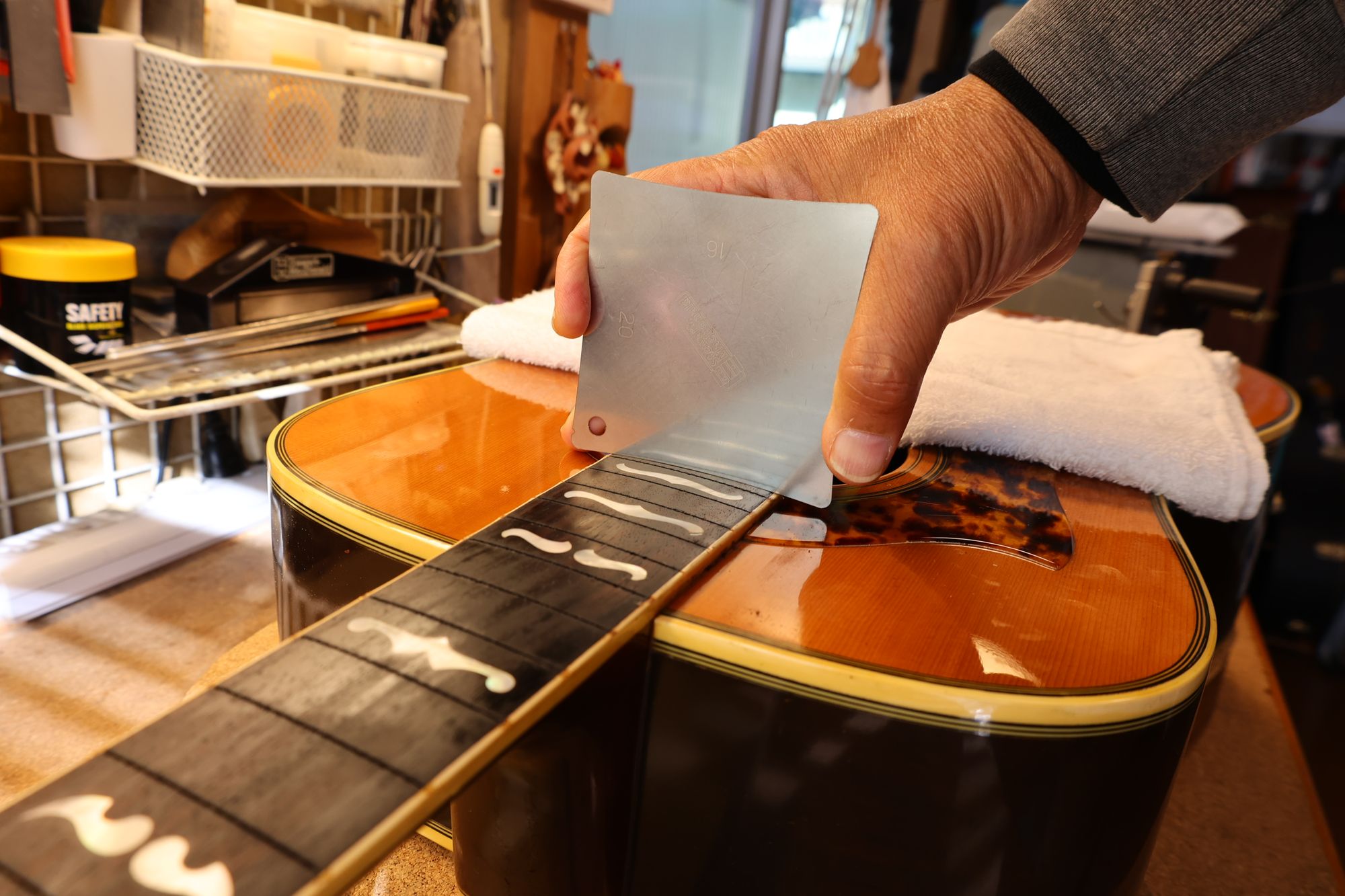 - 3.フィンガーボードの平面性を確認します。
