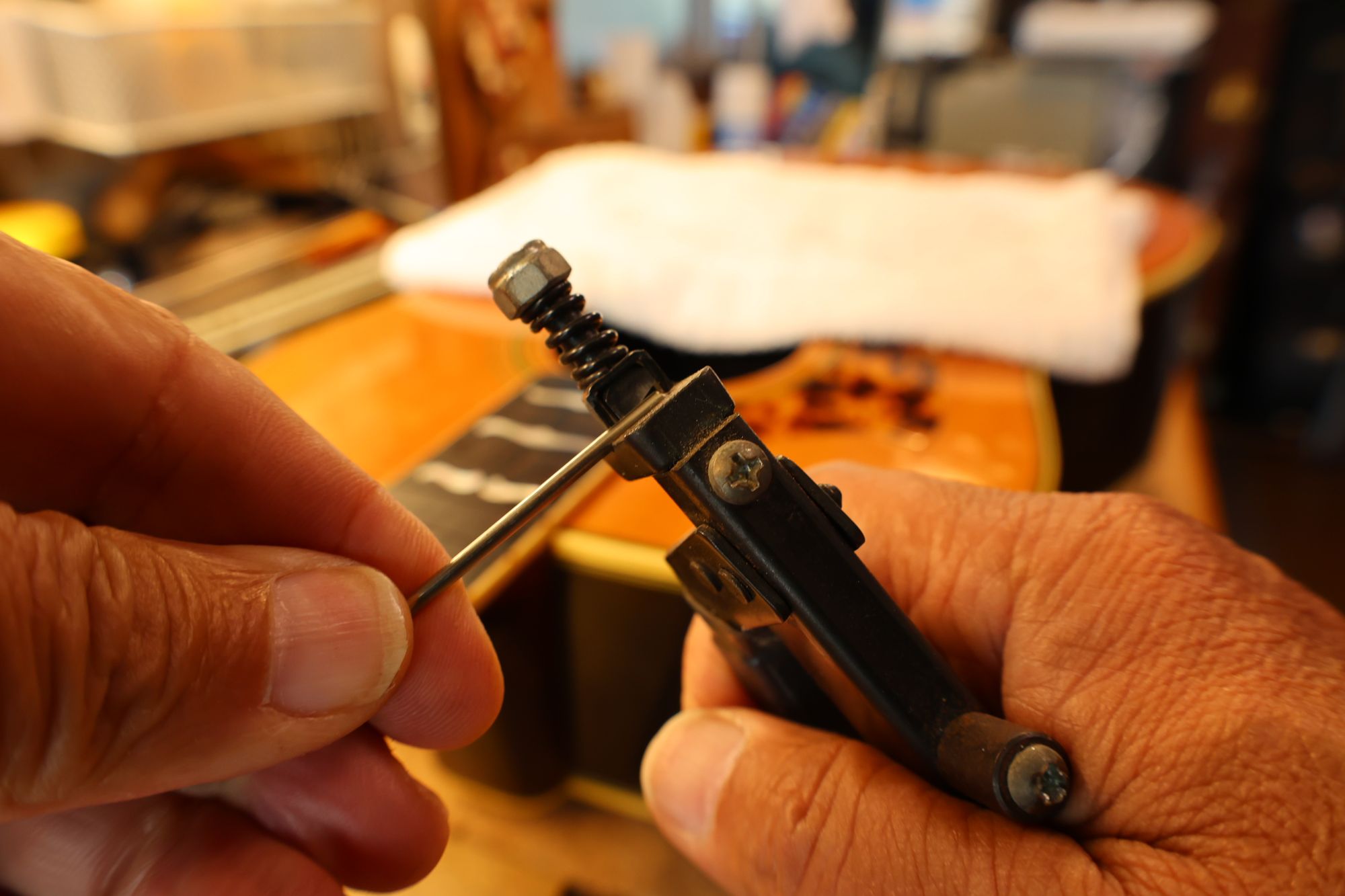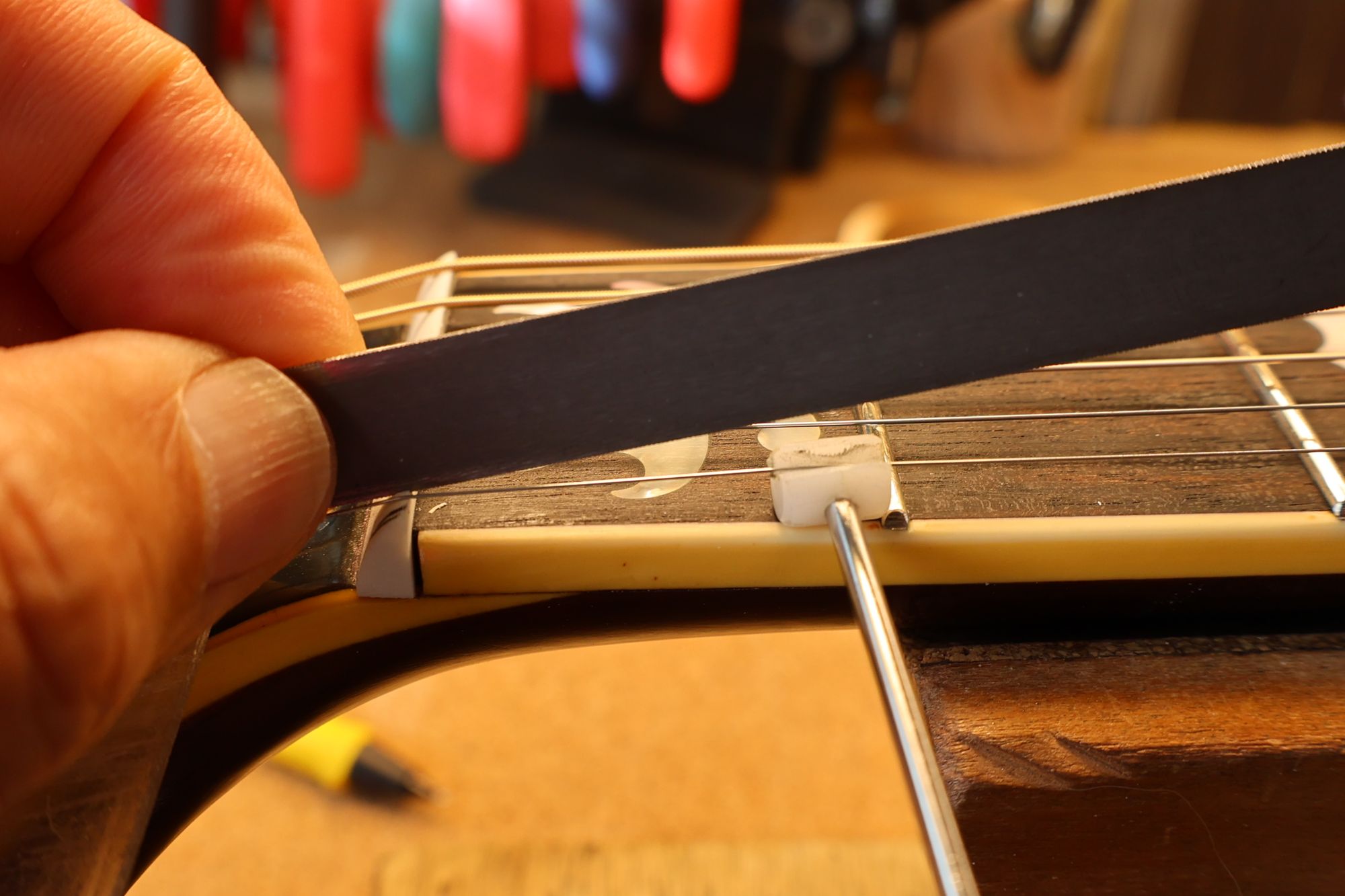 - 20.ストリングリフターで弦を待避させて、ナット溝を徐々に下げていきます。