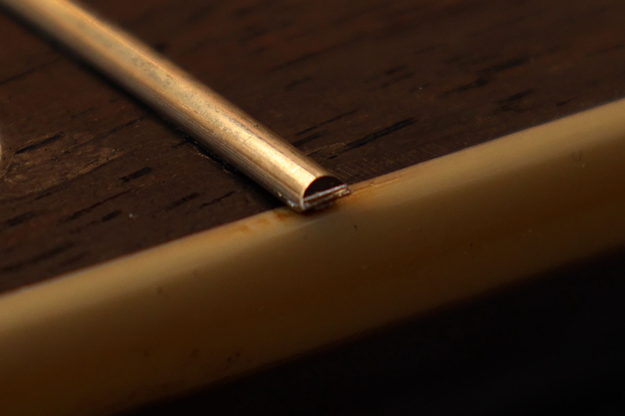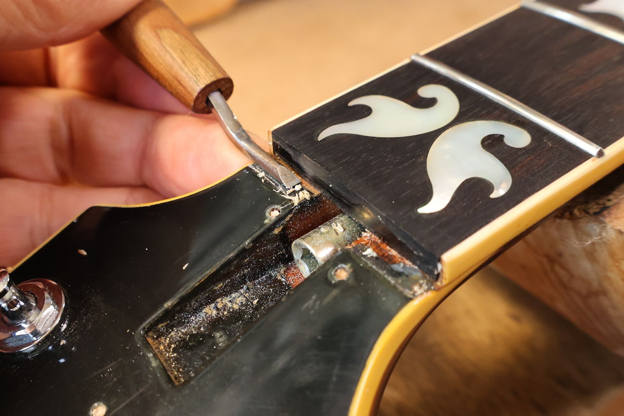 - 5.フレット溝の中のゴミ類を削り出します。このときもフレット溝エッジを傷つけないように注意します。