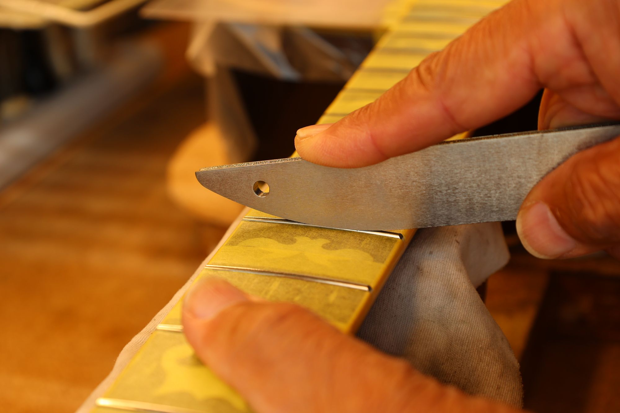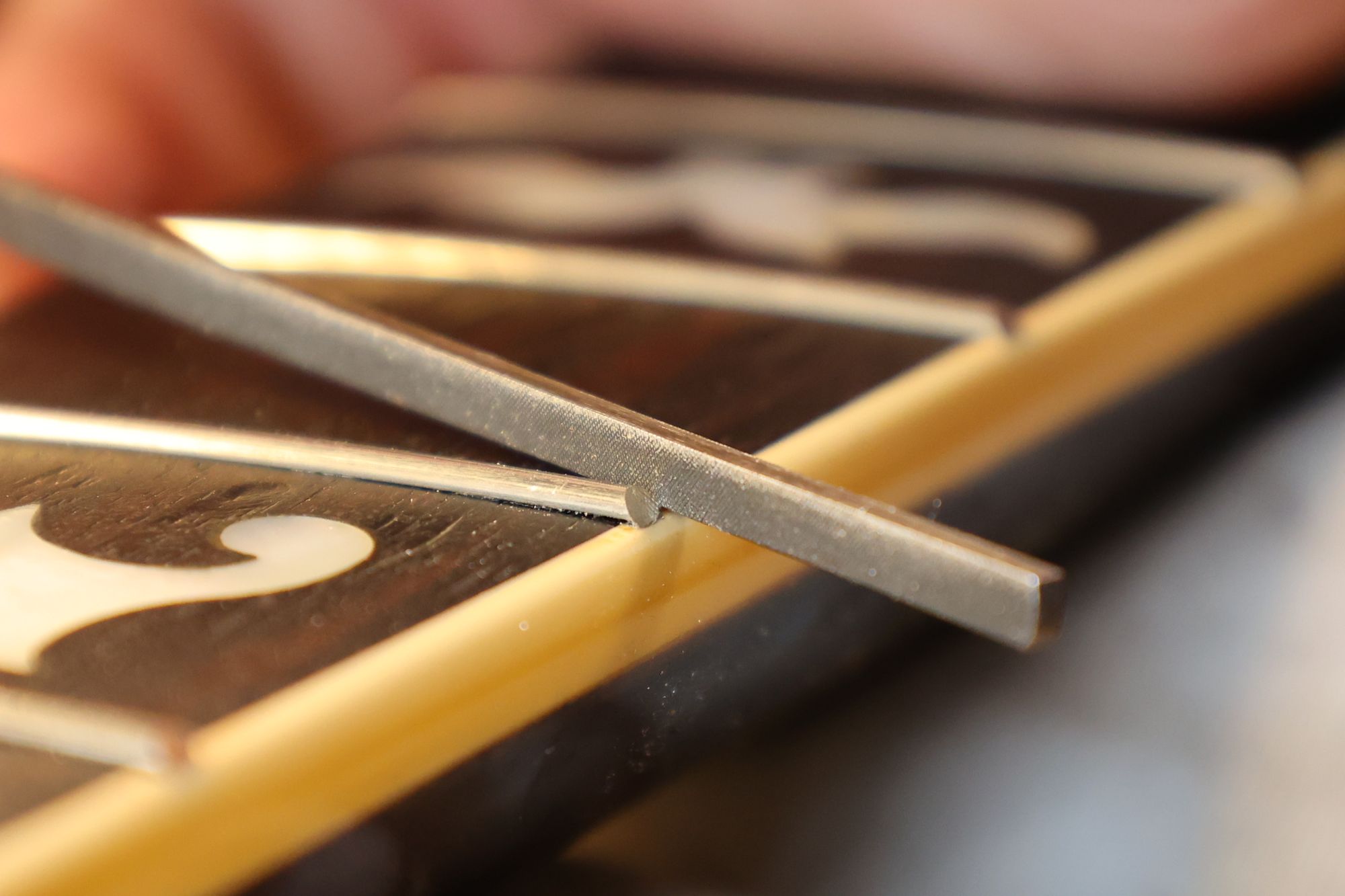 - 27.専用のヤスリを使ってフレット端を整形します。