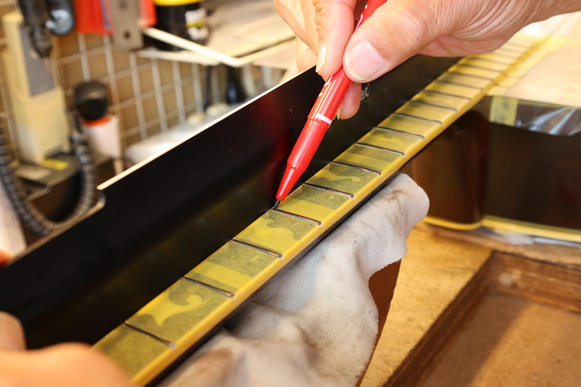 - 33.直定規を乗せて、フレット山が凹んでいる箇所にマークを入れます。