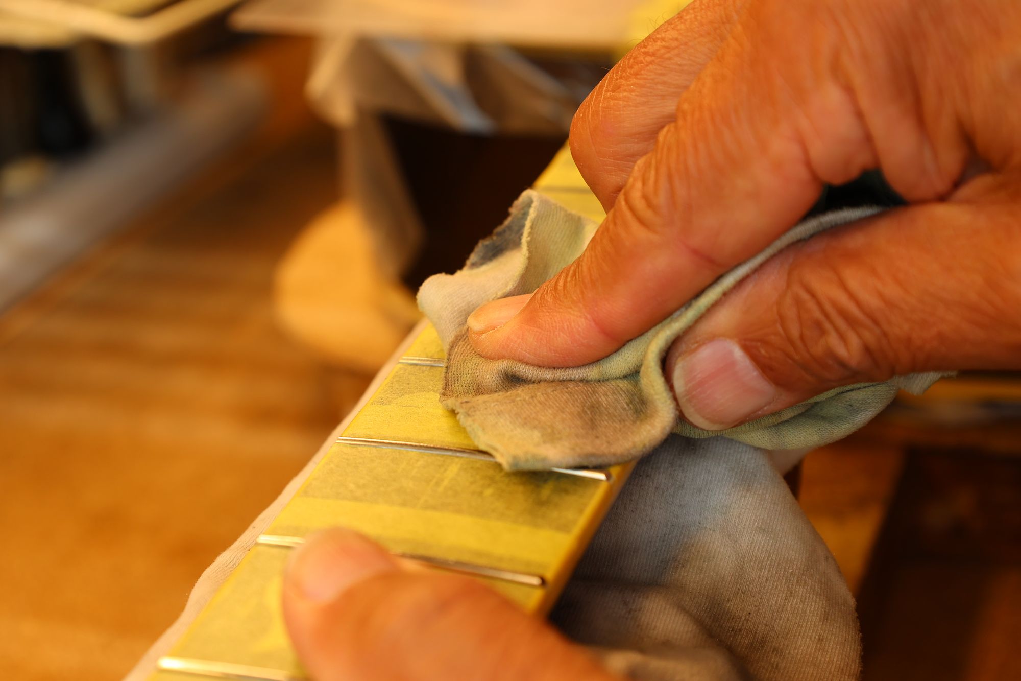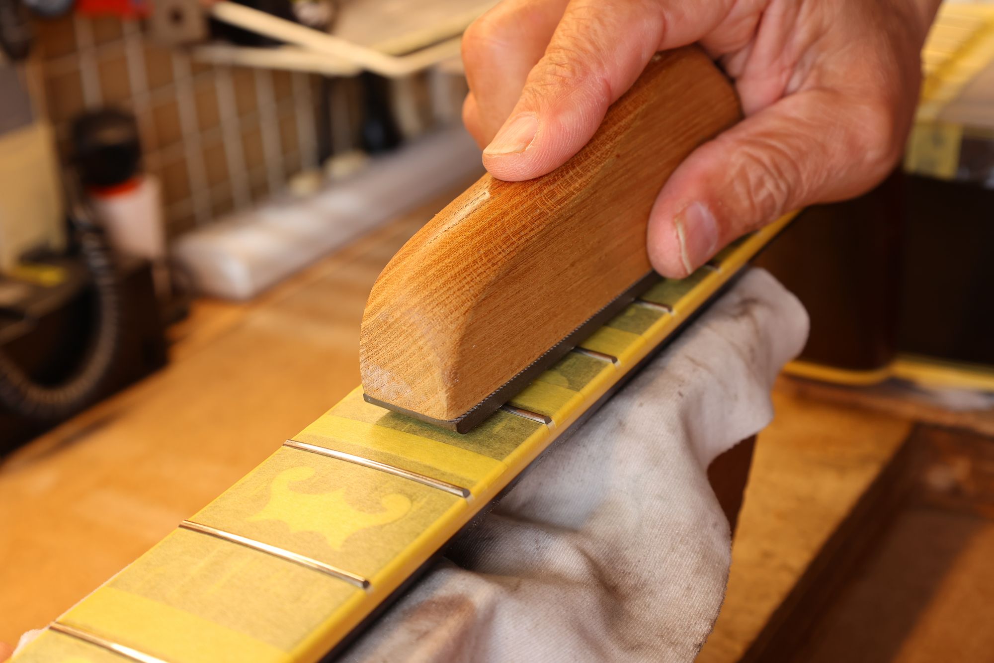 - 31.引き続いてフレットすりあわせを行いましょう。マスキングテープでフィンガーボードを保護します。