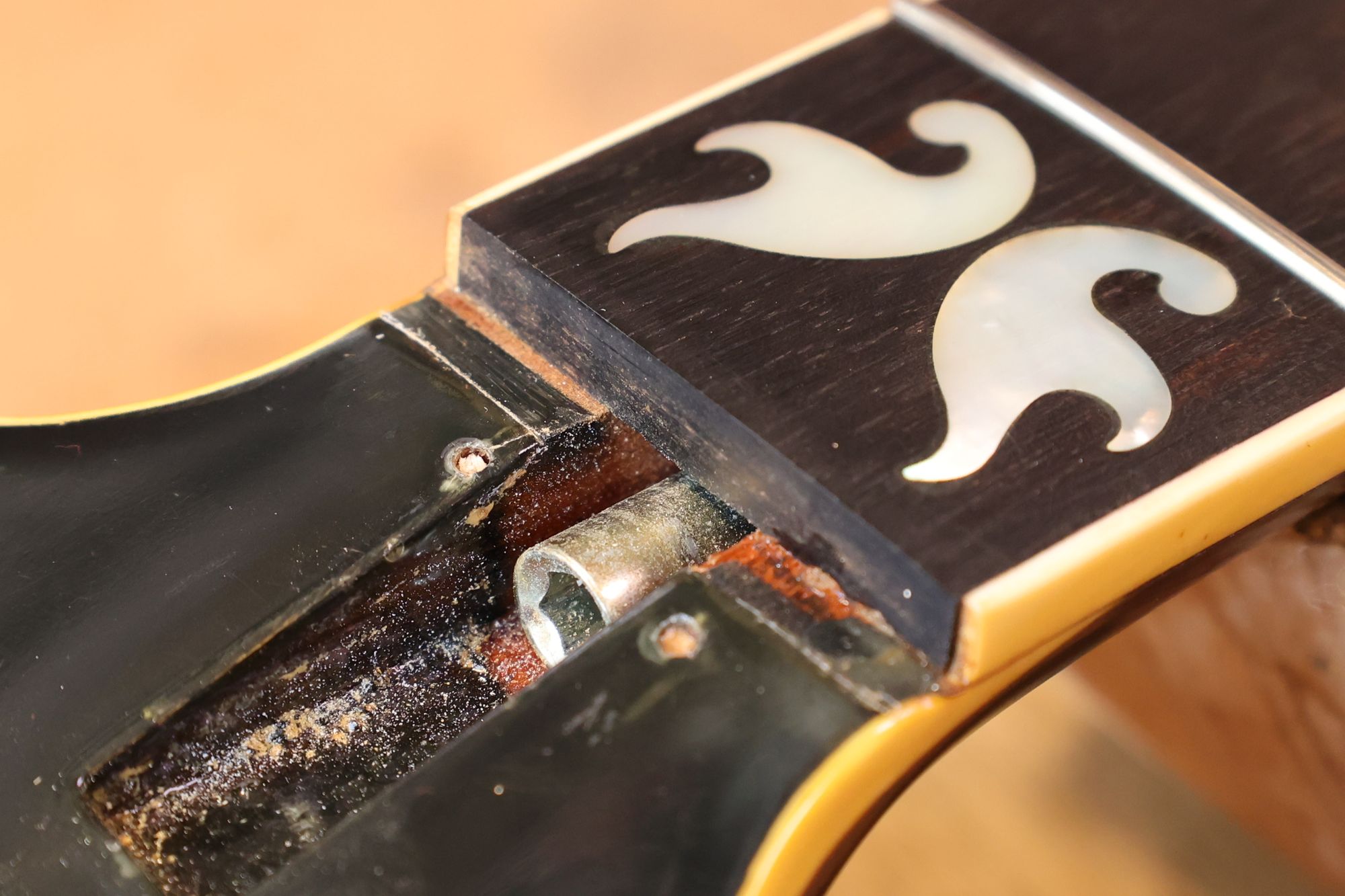 - 5.クリーニング完了したナット溝です。ナットが溝と直接触れることによってギターの音色の改善が期待できます。