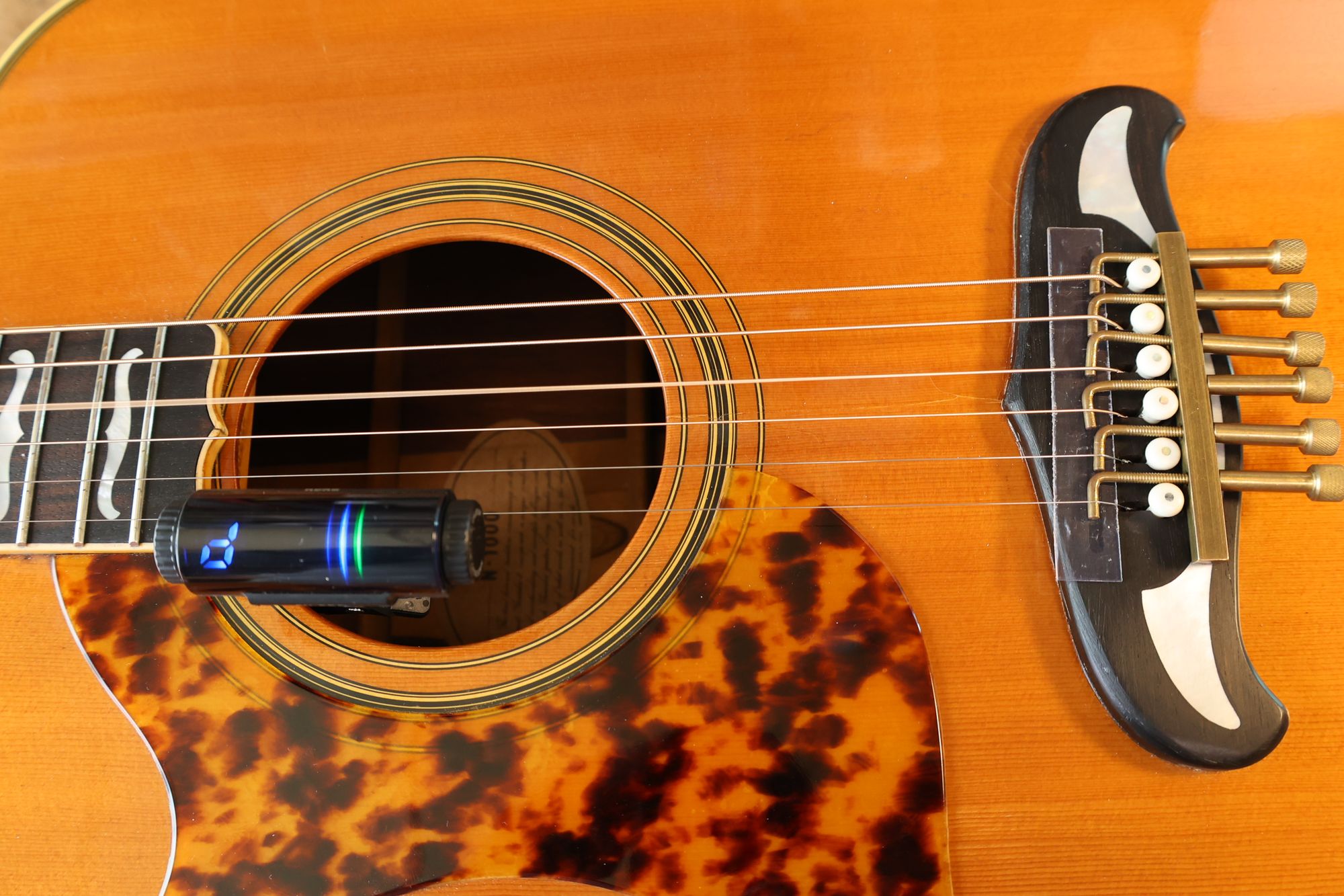 - 1.サウンドホールにチューナー、サドル位置にイントネーターを取り付けました。