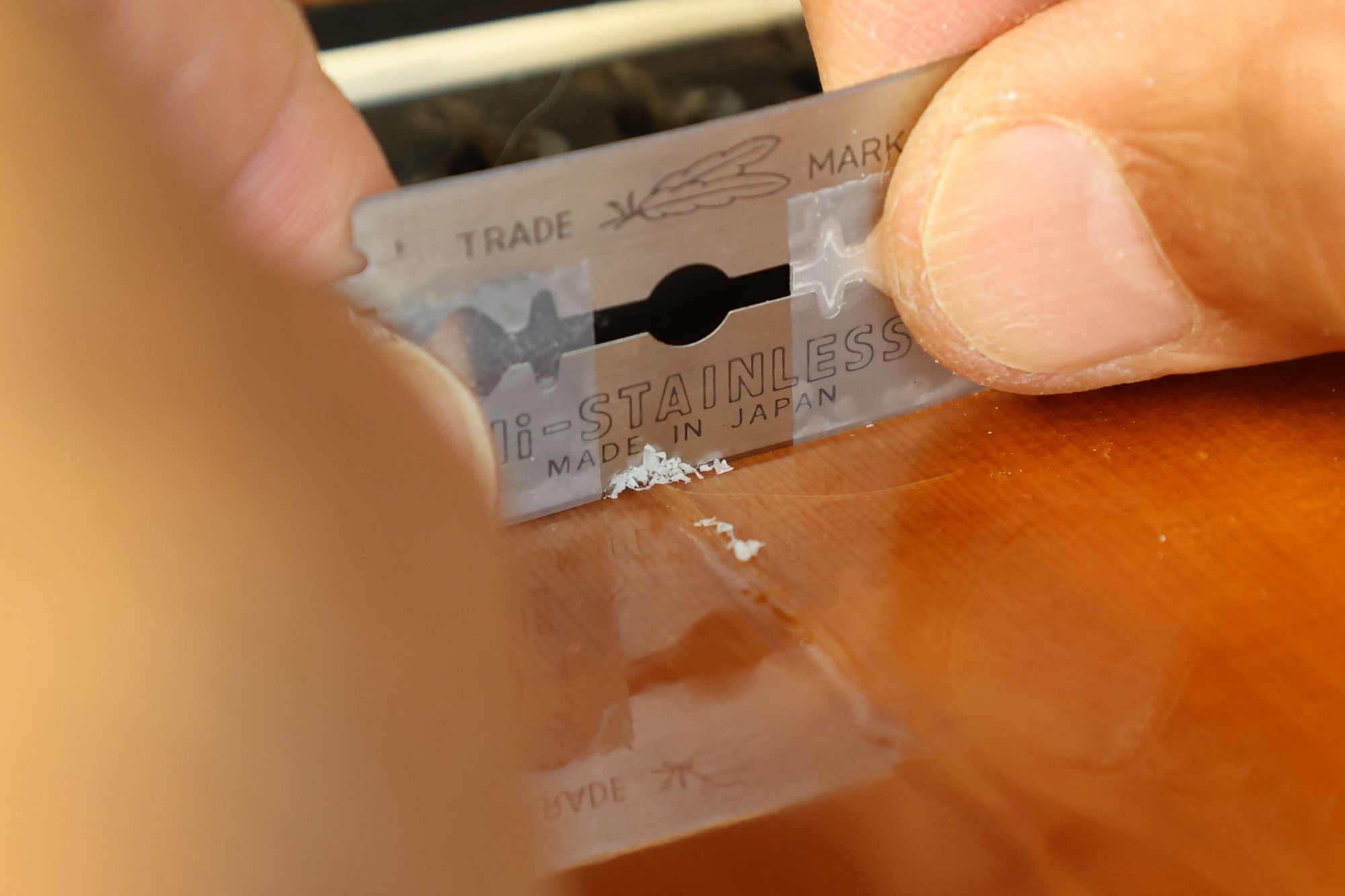 - 6.数日後固着したラッカーをスクレイパーで削り取ります。