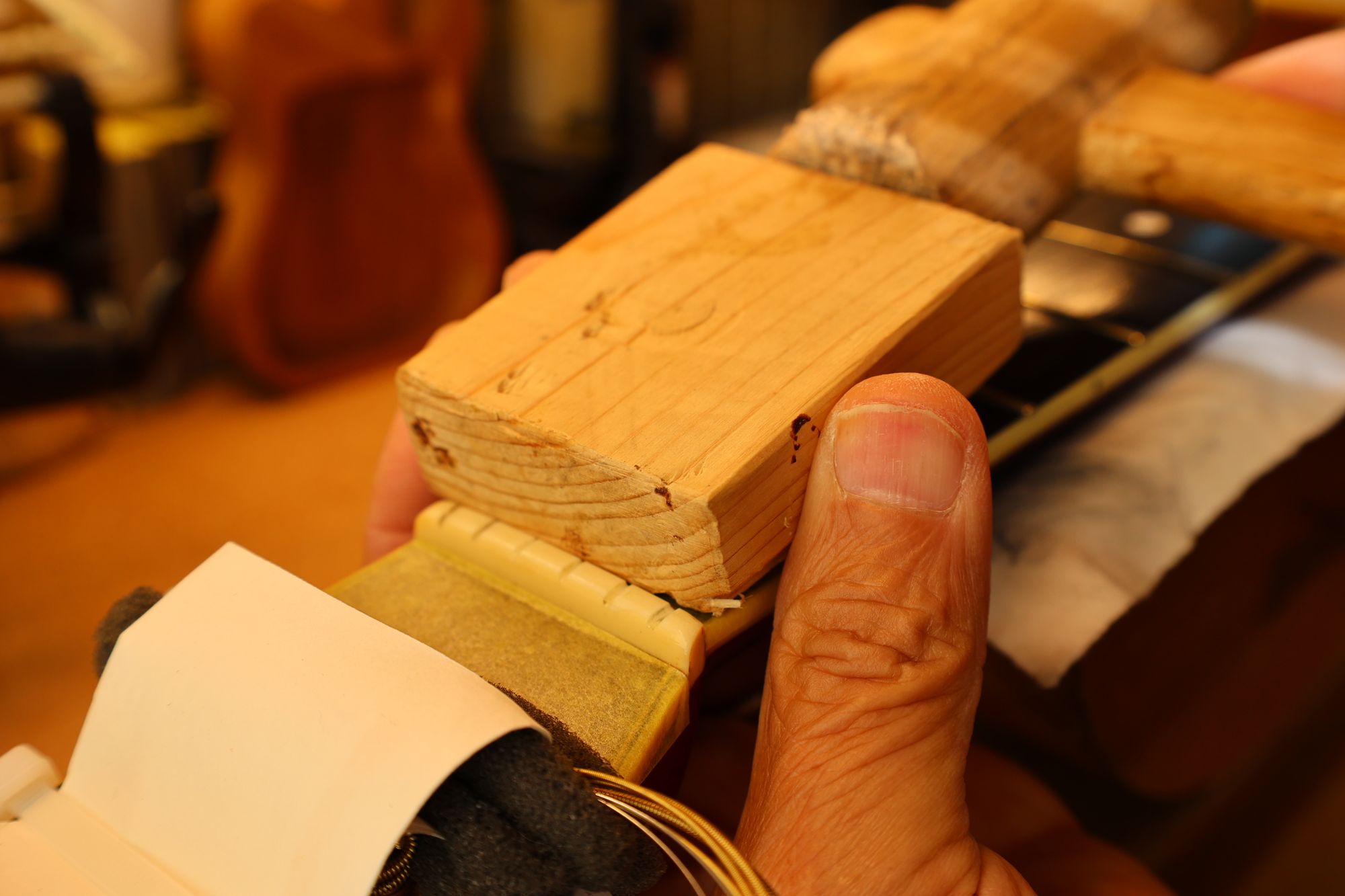 - 21.弦を張って弦高調整を行います。2フレットを指で押さえて1フレットと弦の隙間がギリギリに下がるまでナット高を下げます。