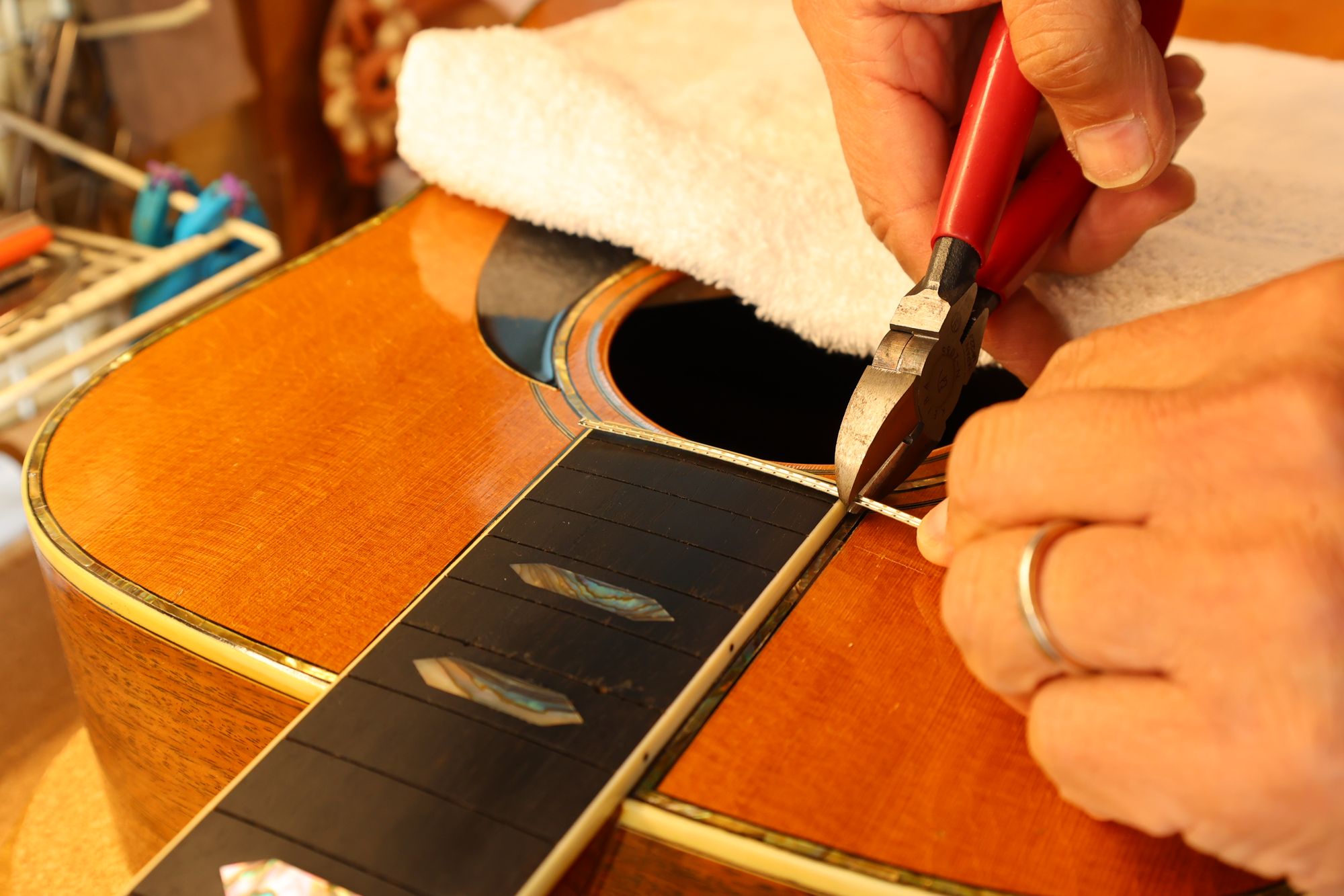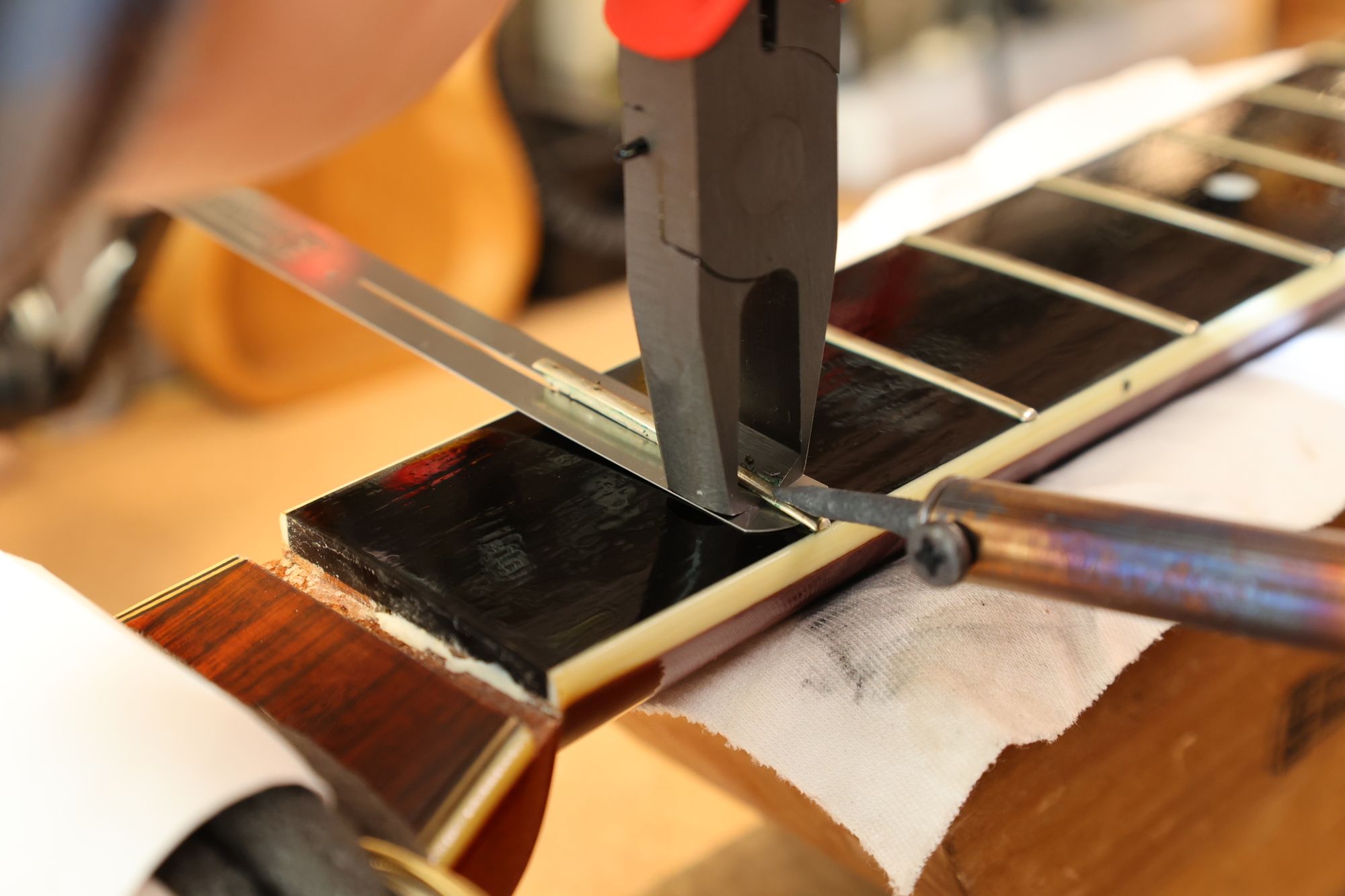 - 27.専用のヤスリを使ってフレット端を整形します。