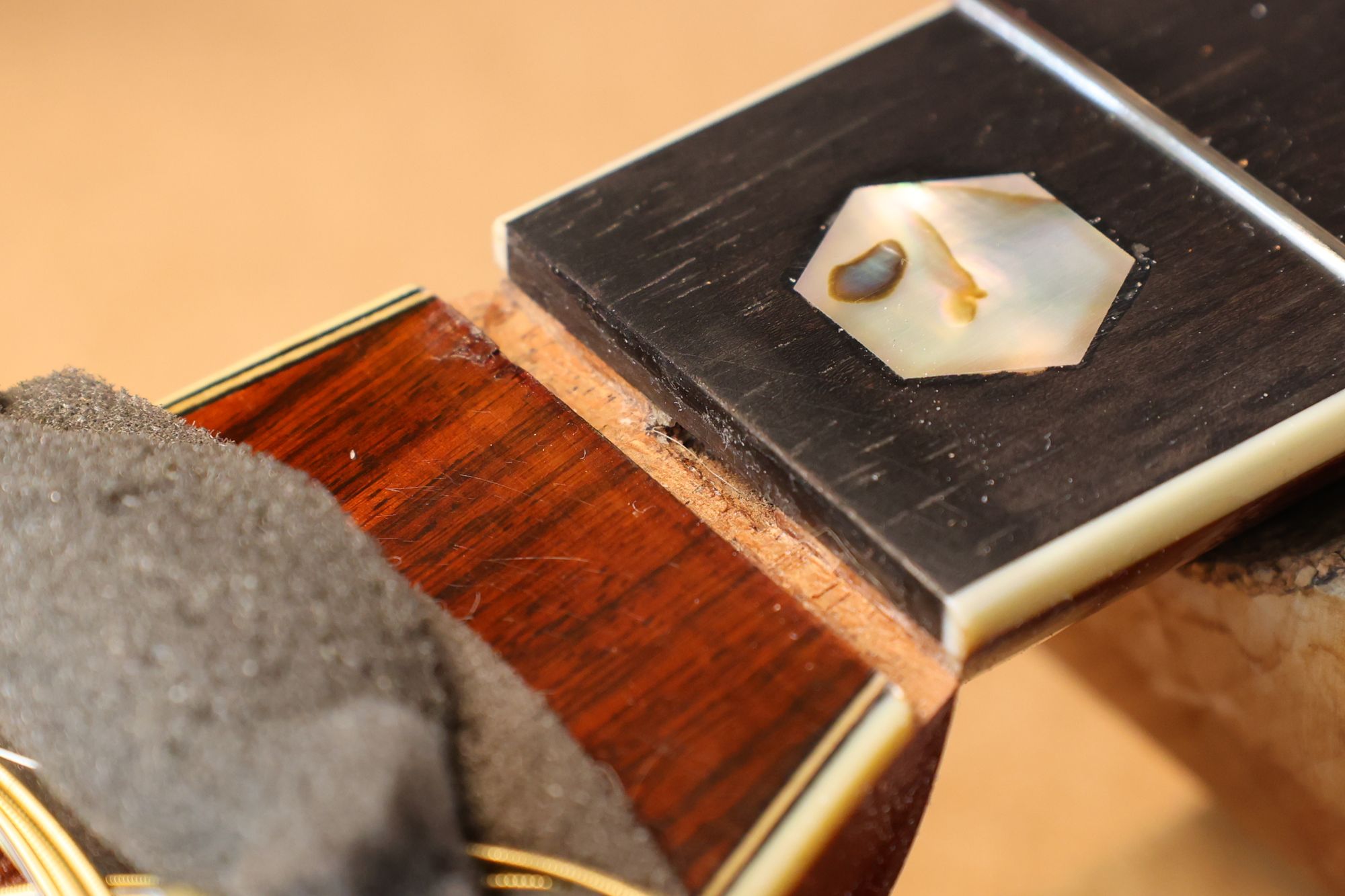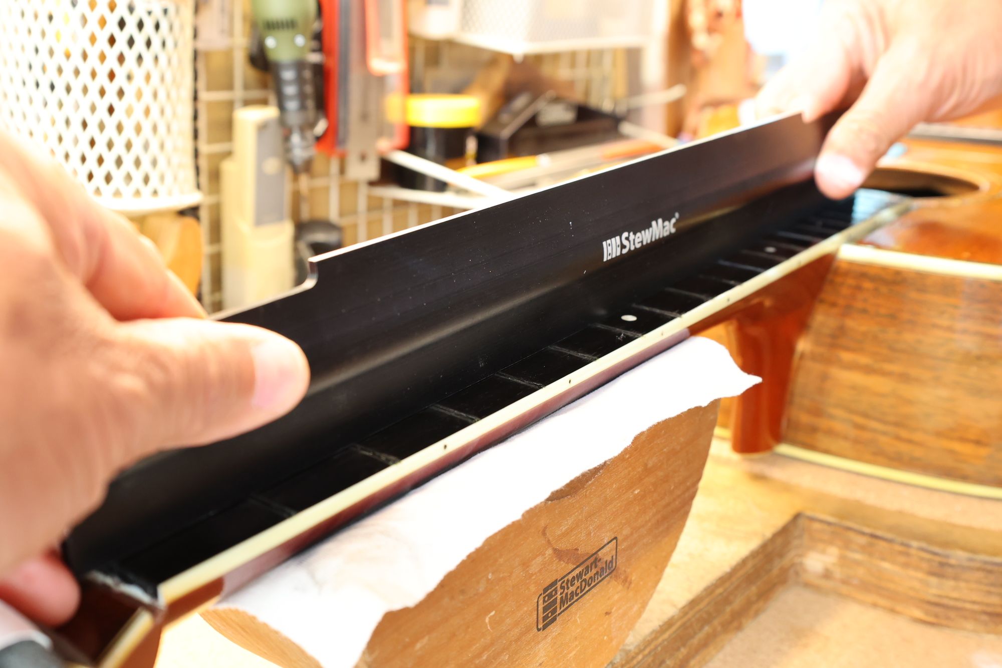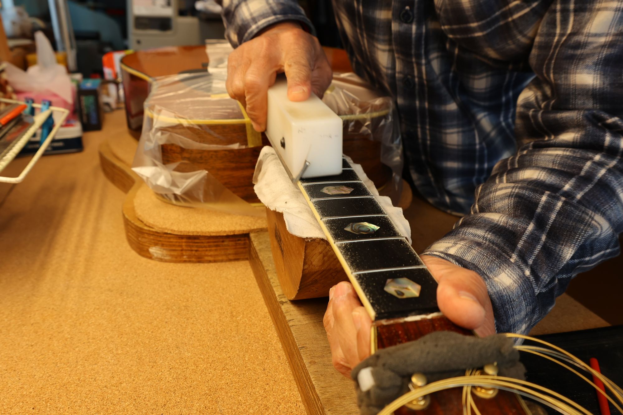- 12.目視および指で触ってネック、フィンガーボードと段差のないことを確認しておきます。