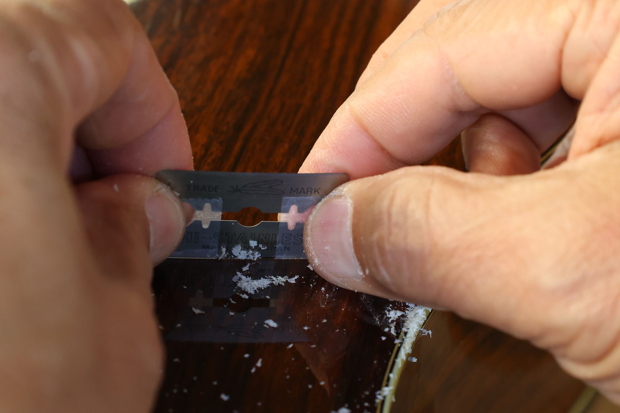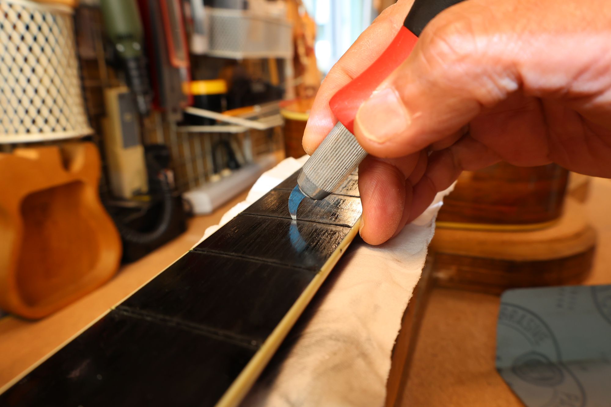 - 5.フレット溝の中のゴミ類を削り出します。このときもフレット溝エッジを傷つけないように注意します。