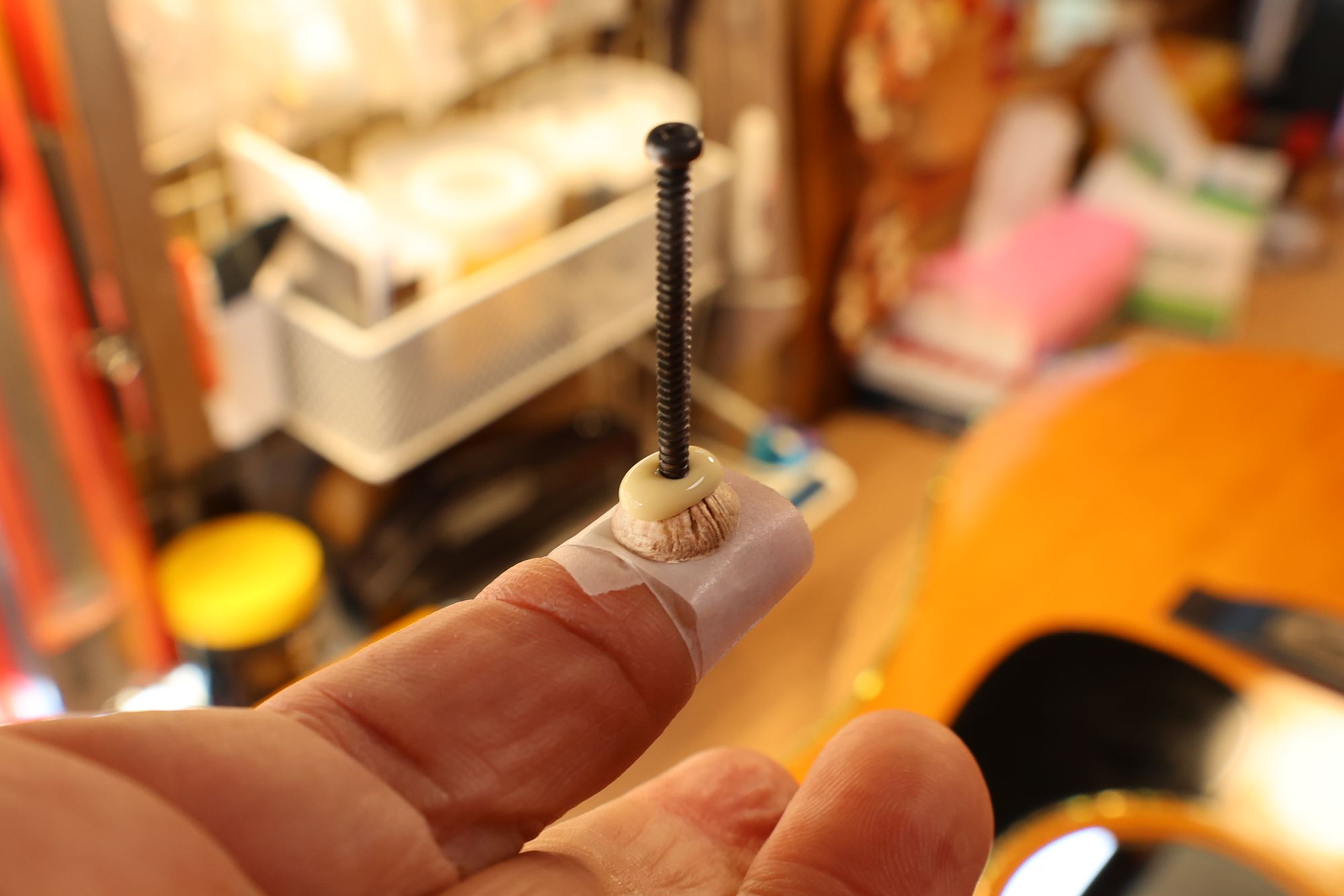 - 14.タイトボンドをプラグにつけて、小ネジを中央の穴にねじ込みます(この小ネジも半固定状態です)。