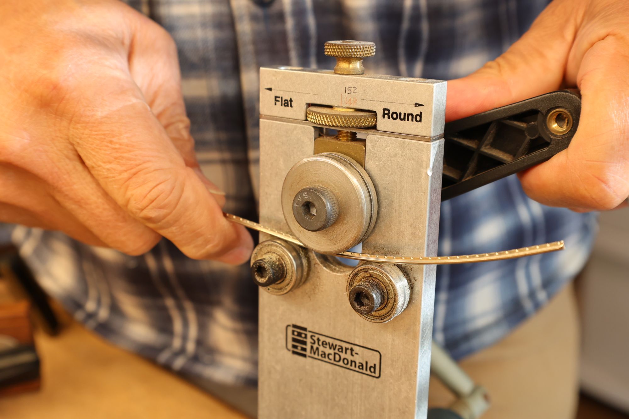 - 9.フレットベンダーでフレットにアールをつけていきます。