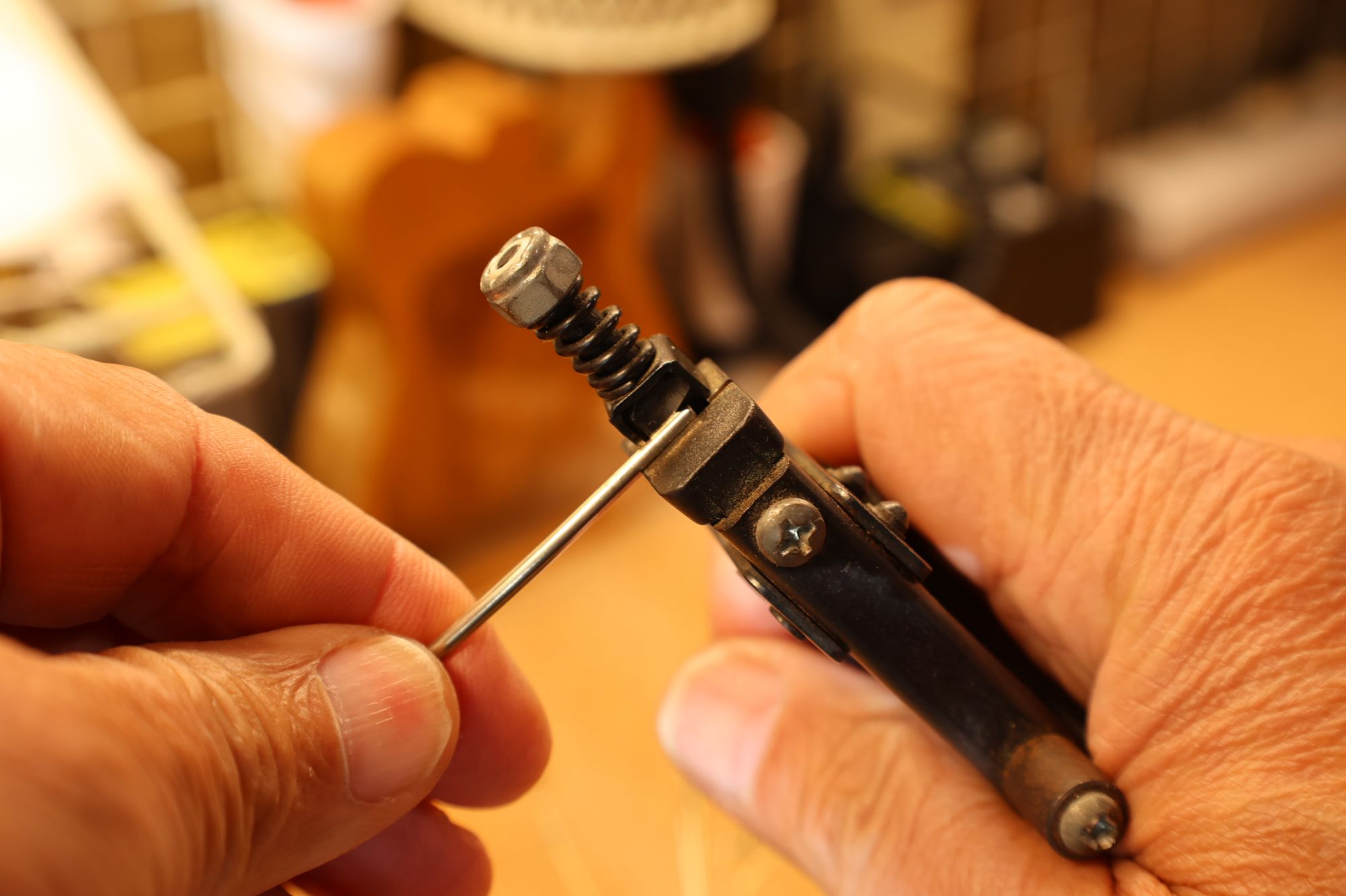 - 22.ストリングリフターで弦を待避させて、ナット溝を徐々に下げていきます。