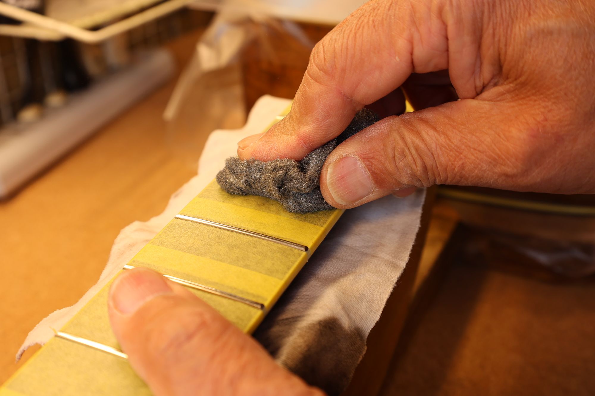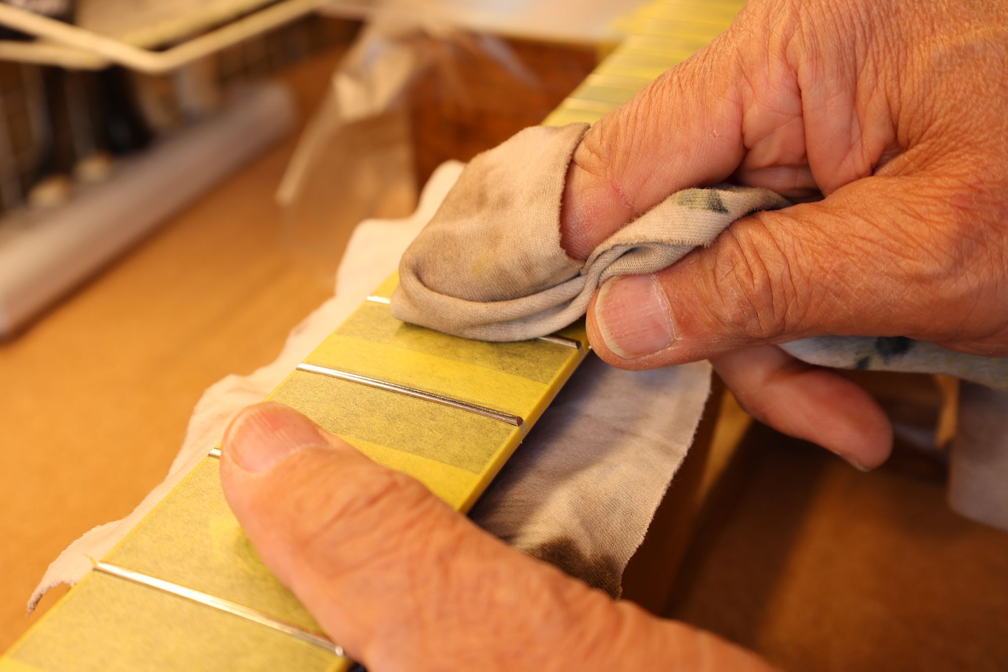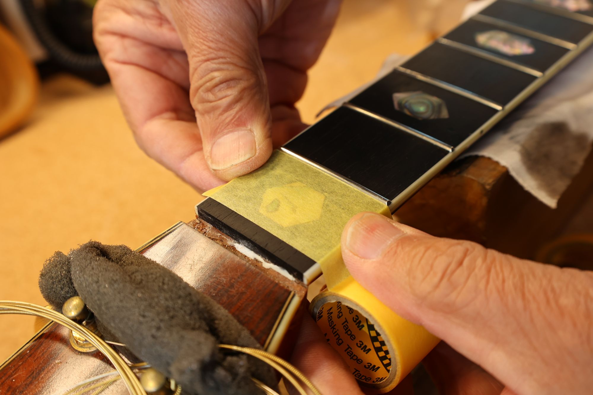 - 31.引き続いてフレットすりあわせを行いましょう。マスキングテープでフィンガーボードを保護します。
