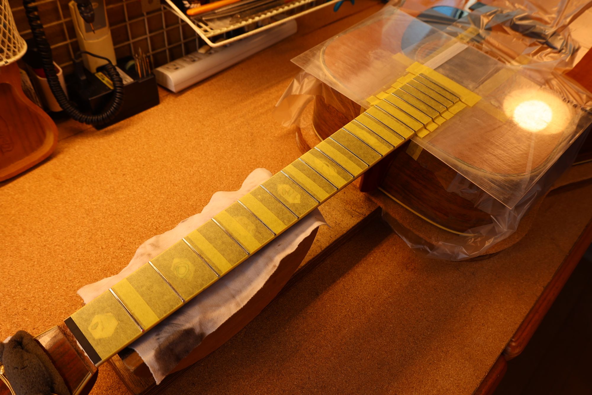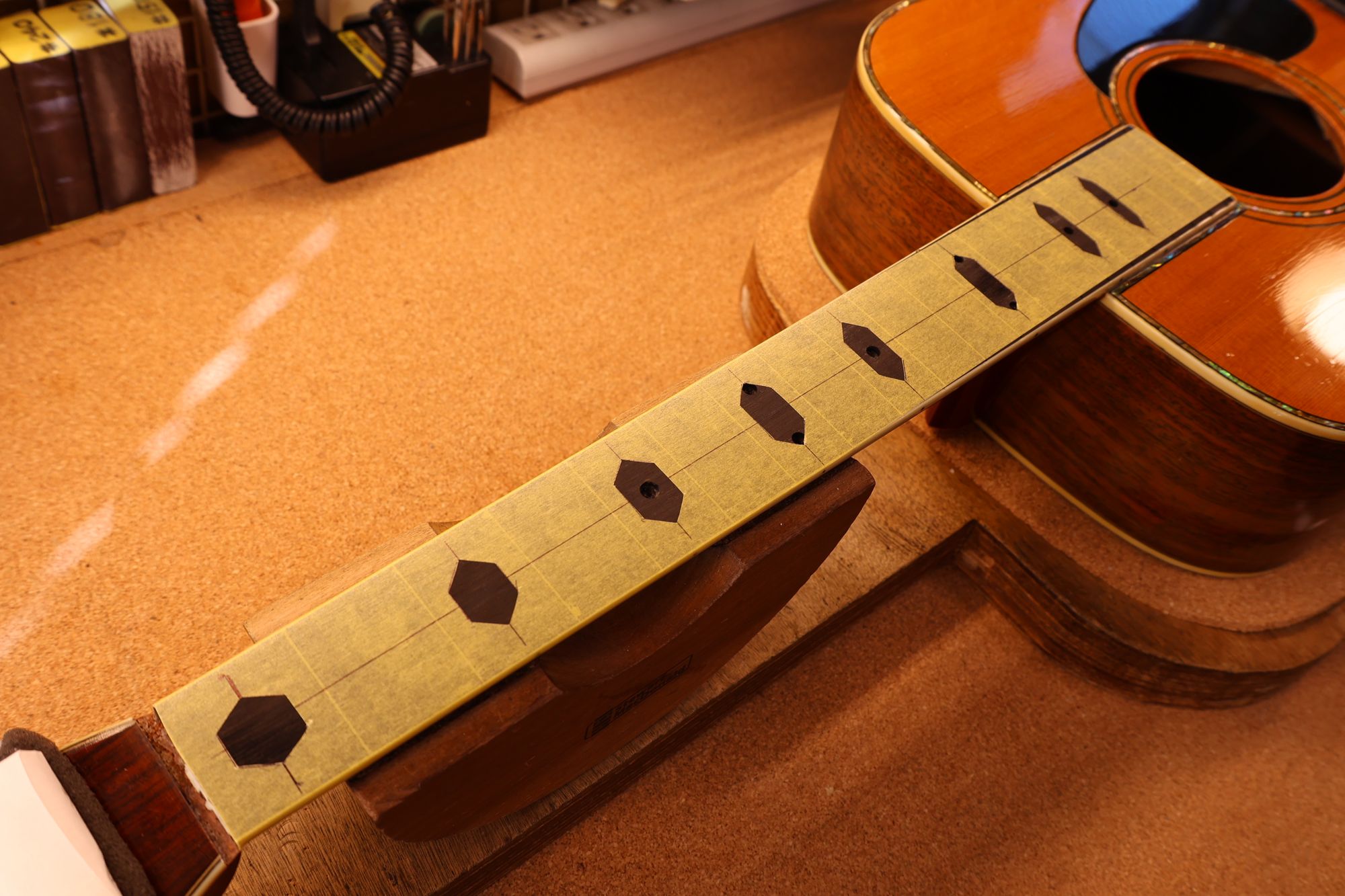 - 8.フィンガーボードをマスキングテープで保護し、インレイ加工位置を書き込みました。
