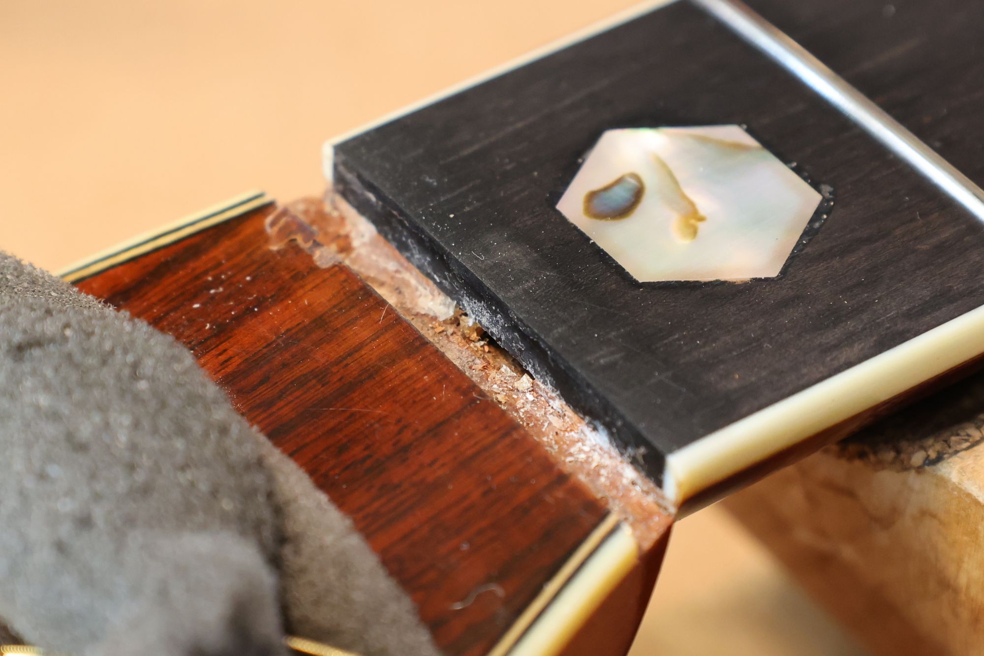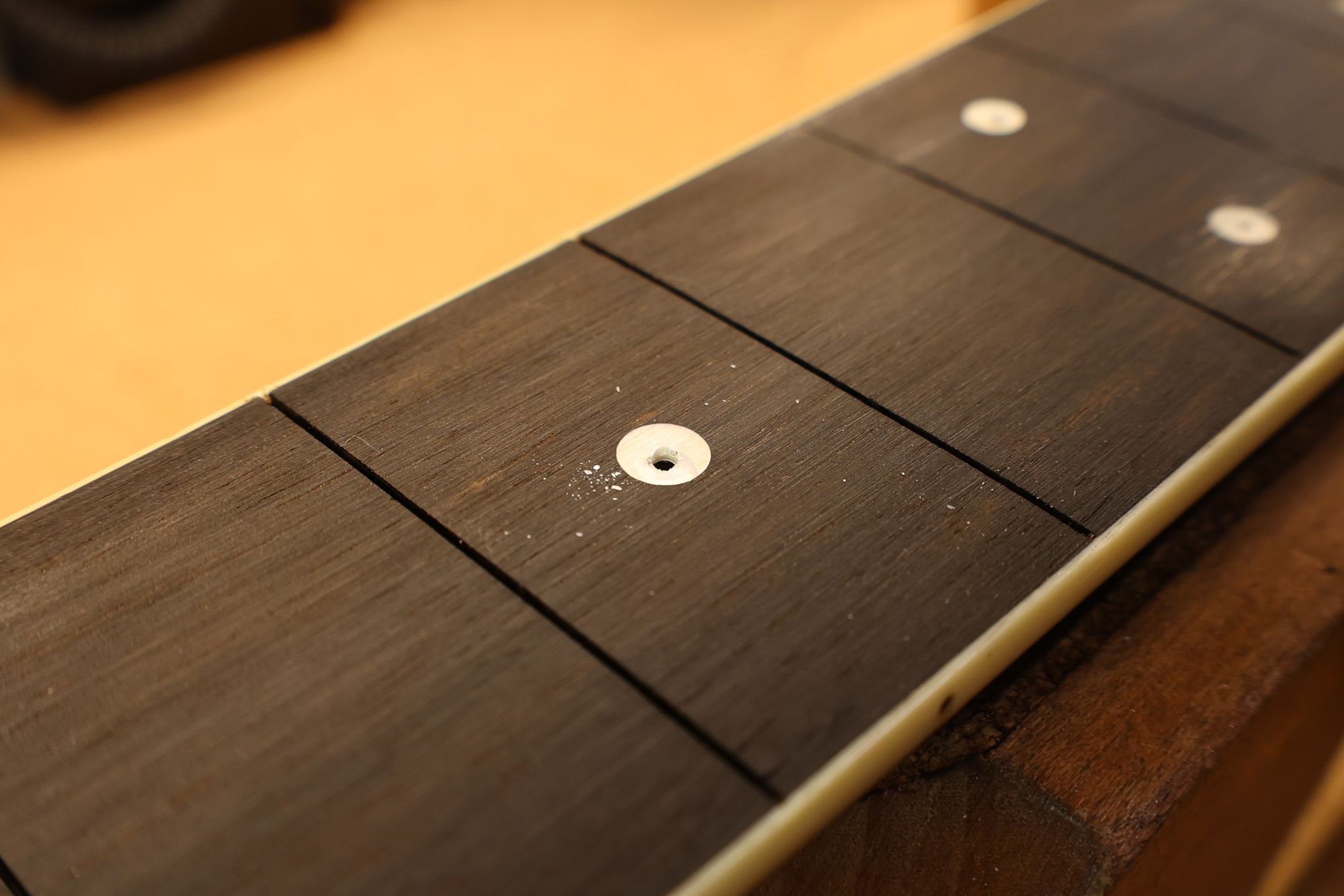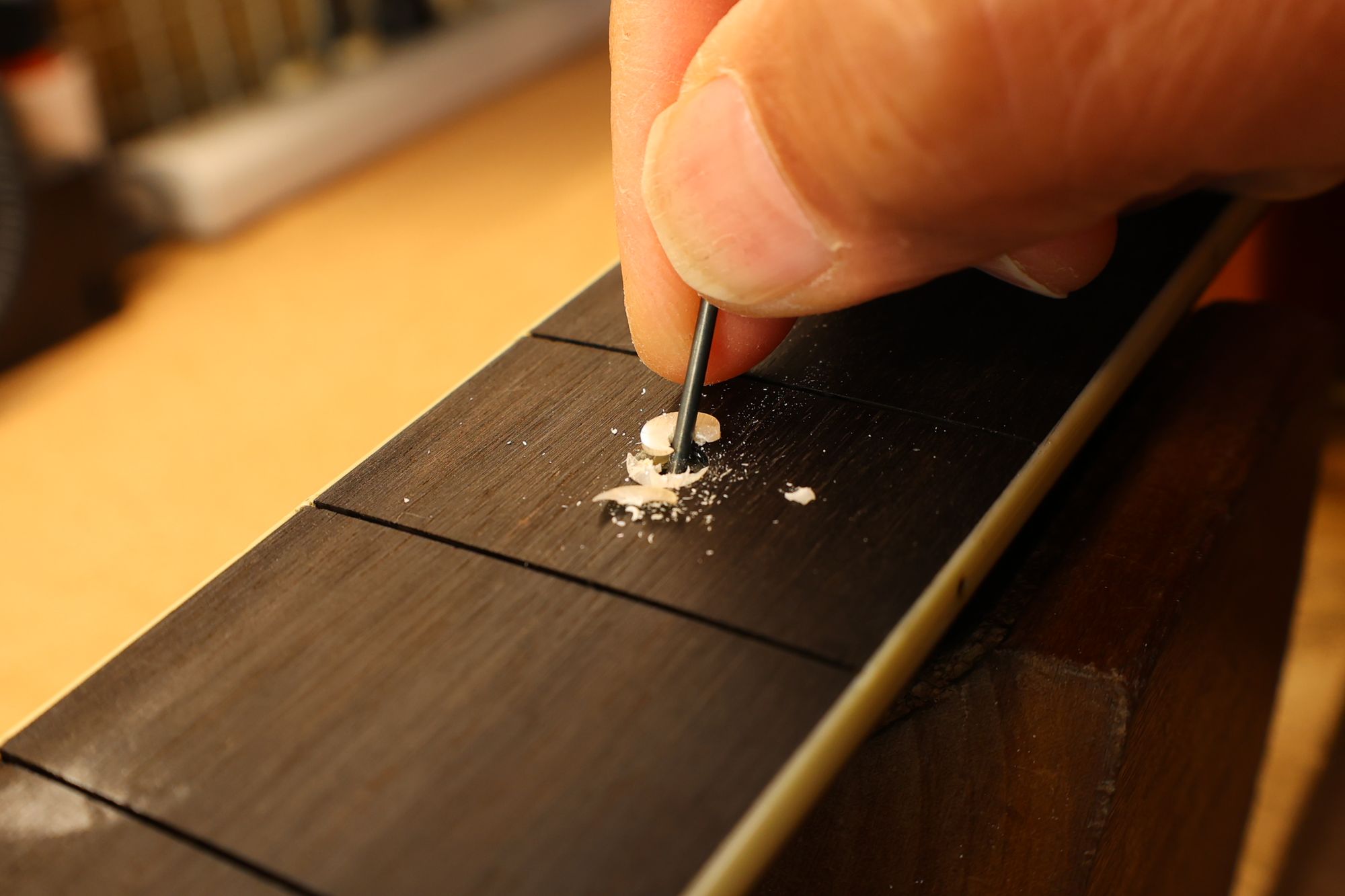 - 2.フレットを抜きました。丸形ポジションマークを六角形のものに入れ替えましょう。