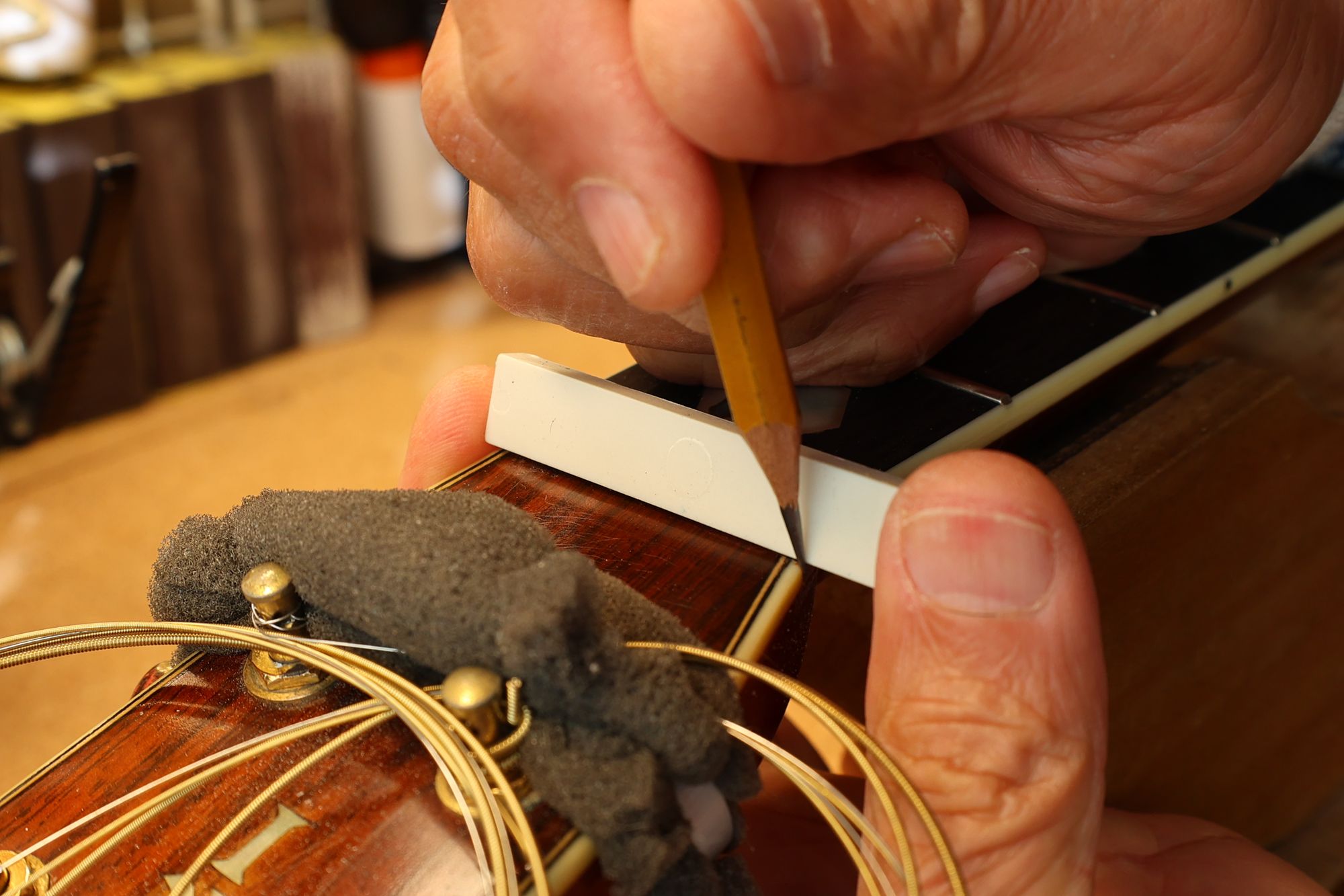 - 18.弦溝位置を新しいナットに書き込みます。