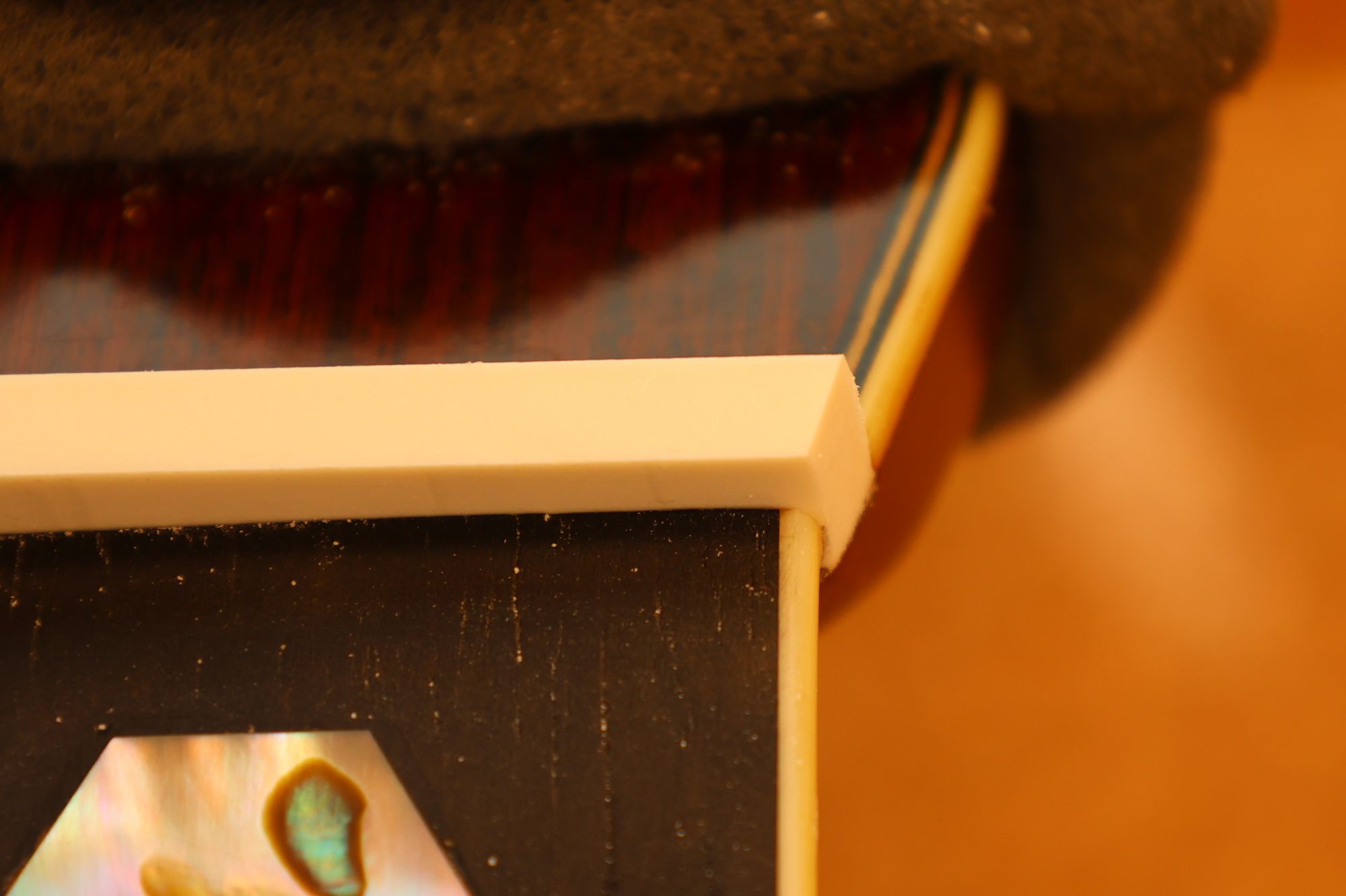 - 10.フィンガーボード面が露出した部分にアバロン素材がはまり込むようにルーターで削り込みます。