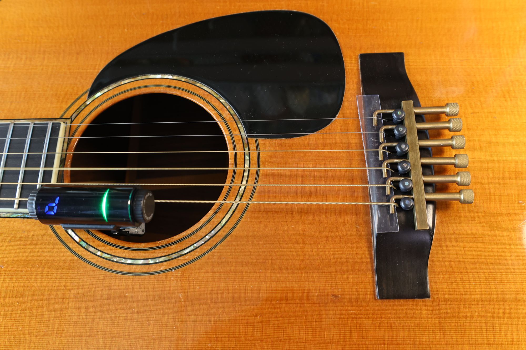 - 1.サウンドホールにチューナー、サドル位置にイントネーターを取り付けました。