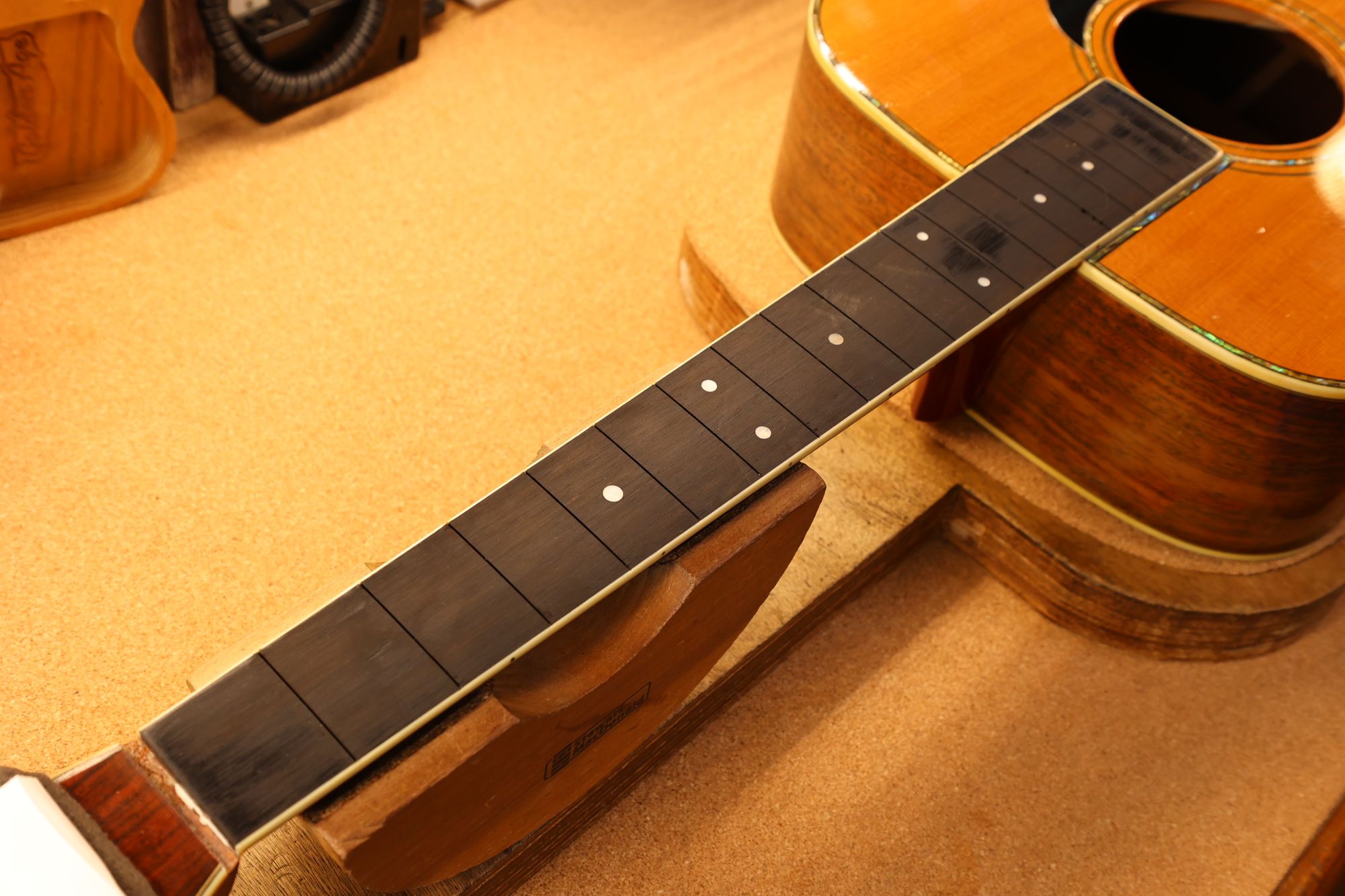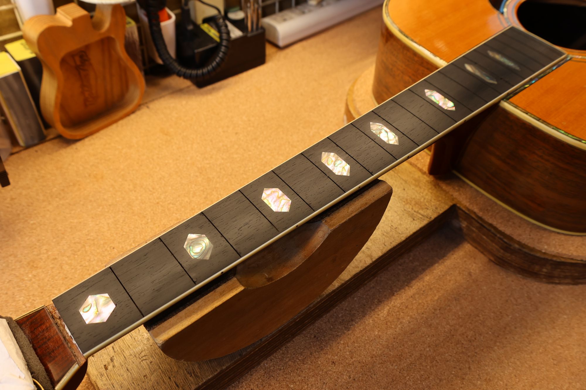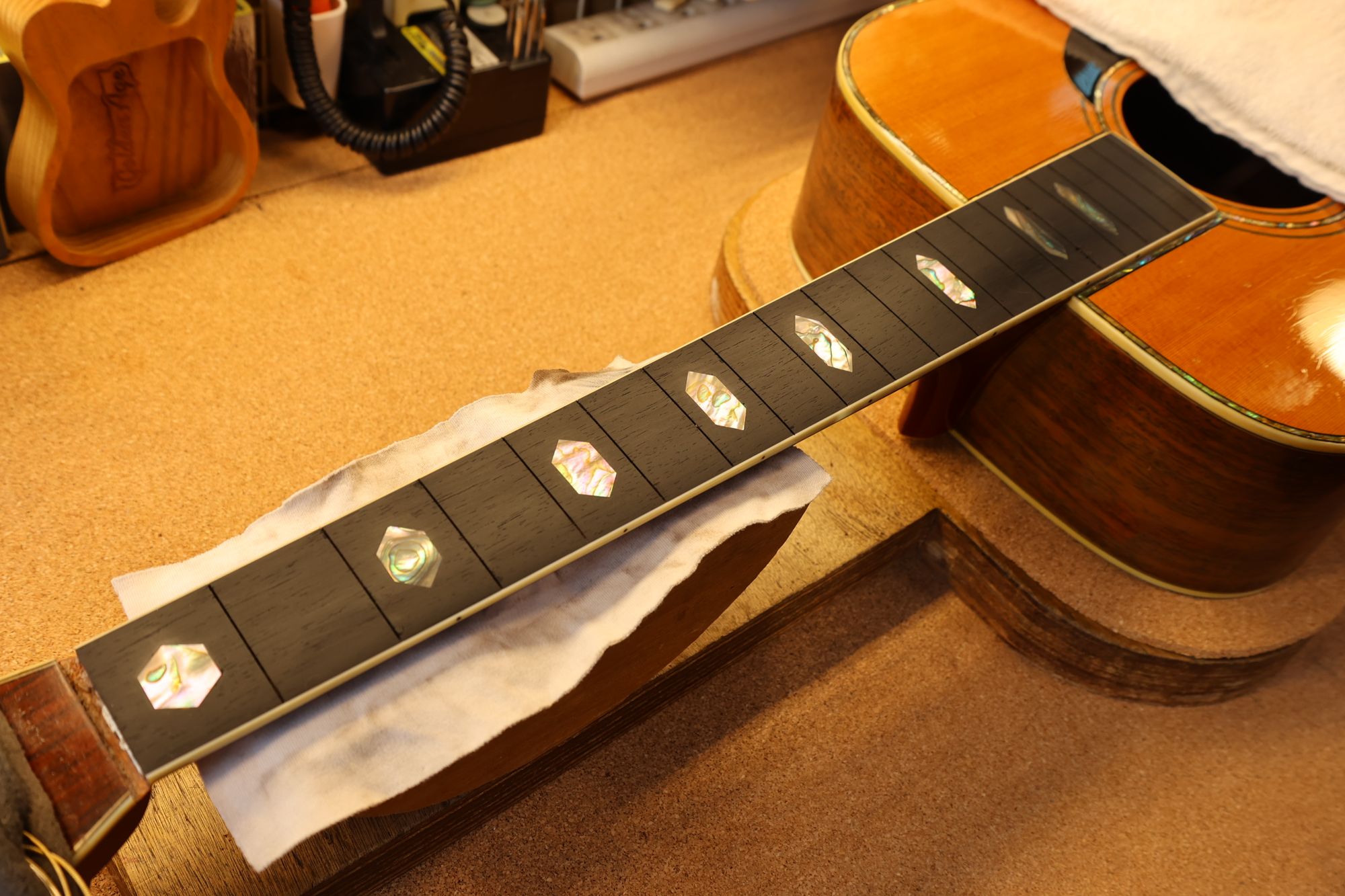 - 16.フレットプレスを行いました。とても美しいフィンガーボードです。